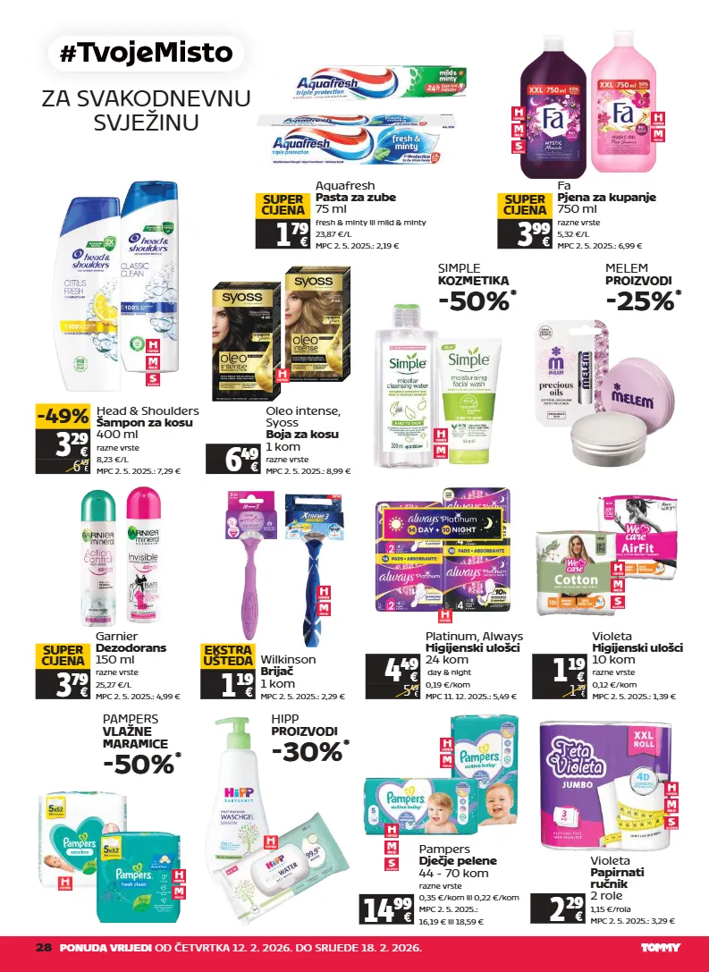 28 ponuda vrijedi od četvrtka 12. 2. 2026. do srijede 18. 2. 2026. za svakodnevnu svježinu aquafresh pasta za zube 75 ml fresh & minty ili mild & minty 23,87 €/l mpc 2. 5. 2025.: 2,19 € 1 79 super cijena 3 29 6 49 -49% head & shoulders šampon za kosu 400 ml razne vrste 8,23 €/l mpc 2. 5. 2025.: 7,29 € fa pjena za kupanje 750 ml razne vrste 5,32 €/l mpc 2. 5. 2025.: 6,99 € 3 99 super cijena oleo intense, syoss boja za kosu 1 kom razne vrste mpc 2. 5. 2025.: 8,99 € 6 49 simple kozmetika -50% * melem proizvodi -25% * garnier dezodorans 150 ml razne vrste 25,27 €/l mpc 2. 5. 2025.: 4,99 € 3 79 super cijena 4 49 5 49 platinum, always higijenski ulošci 24 kom day & night 0,19 €/kom mpc 11. 12. 2025.: 5,49 € 1 19 1 39 violeta higijenski ulošci 10 kom razne vrste 0,12 €/kom mpc 2. 5. 2025.: 1,39 € pampers vlažne maramice -50% * hipp proizvodi -30% * wilkinson brijač 1 kom mpc 2. 5. 2025.: 2,29 € 1 19 ekstra ušteda violeta papirnati ručnik 2 role 1,15 €/rola mpc 2. 5. 2025.: 3,29 € 2 29 14 99 pampers dječje pelene 44 - 70 kom razne vrste 0,35 €/kom ili 0,22 €/kom mpc 2. 5. 2025.: 16,19 € ili 18,59 €