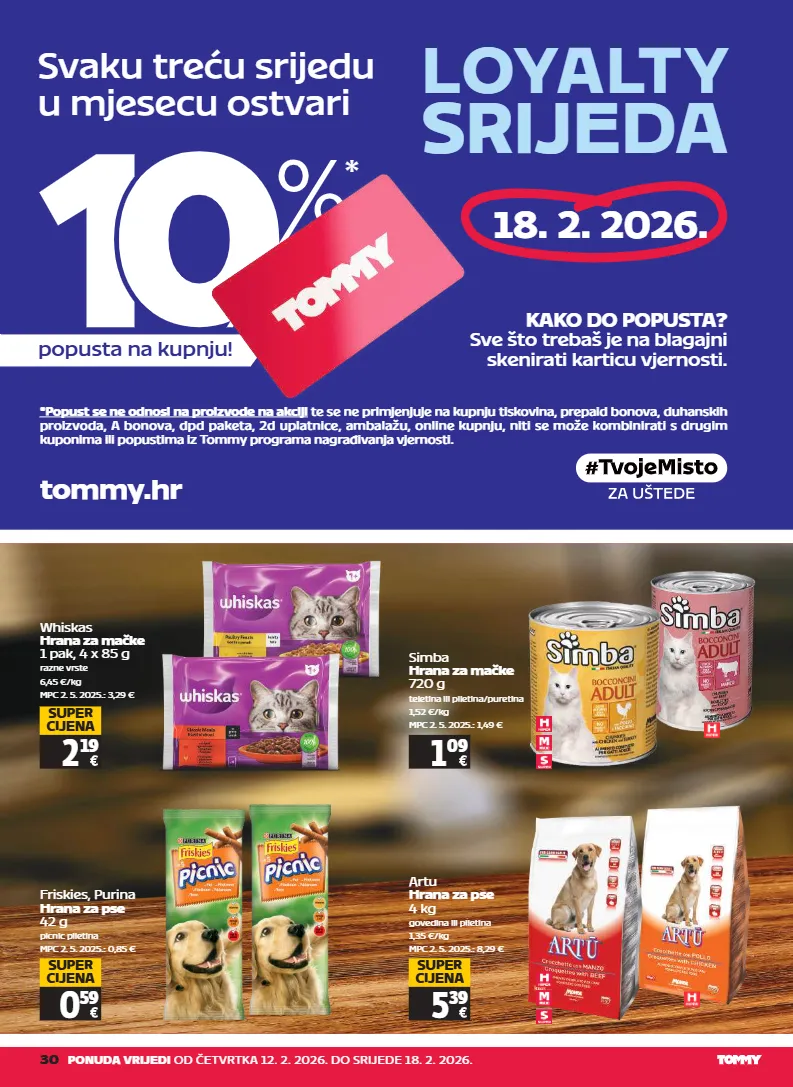 30 ponuda vrijedi od četvrtka 12. 2. 2026. do srijede 18. 2. 2026. whiskas hrana za mačke 1 pak, 4 x 85 g razne vrste 6,45 €/kg mpc 2. 5. 2025.: 3,29 € 2 19 super cijena simba hrana za mačke 720 g teletina ili piletina/puretina 1,52 €/kg mpc 2. 5. 2025.: 1,49 € 1 09 friskies, purina hrana za pse 42 g picnic piletina mpc 2. 5. 2025.: 0,85 € 0 59 super cijena artu hrana za pse 4 kg govedina ili piletina 1,35 €/kg mpc 2. 5. 2025.: 8,29 € 5 39 super cijena popusta na kupnju! svaku treću srijedu u mjesecu ostvari 18. 2. 2026. loyalty srijeda *popust se ne odnosi na proizvode na akciji te se ne primjenjuje na kupnju tiskovina, prepaid bonova, duhanskih proizvoda, a bonova, dpd paketa, 2d uplatnice, ambalažu, online kupnju, niti se može kombinirati s drugim kuponima ili popustima iz tommy programa nagrađivanja vjernosti. kako do popusta? sve što trebaš je na blagajni skenirati karticu vjernosti. tommy.hr *