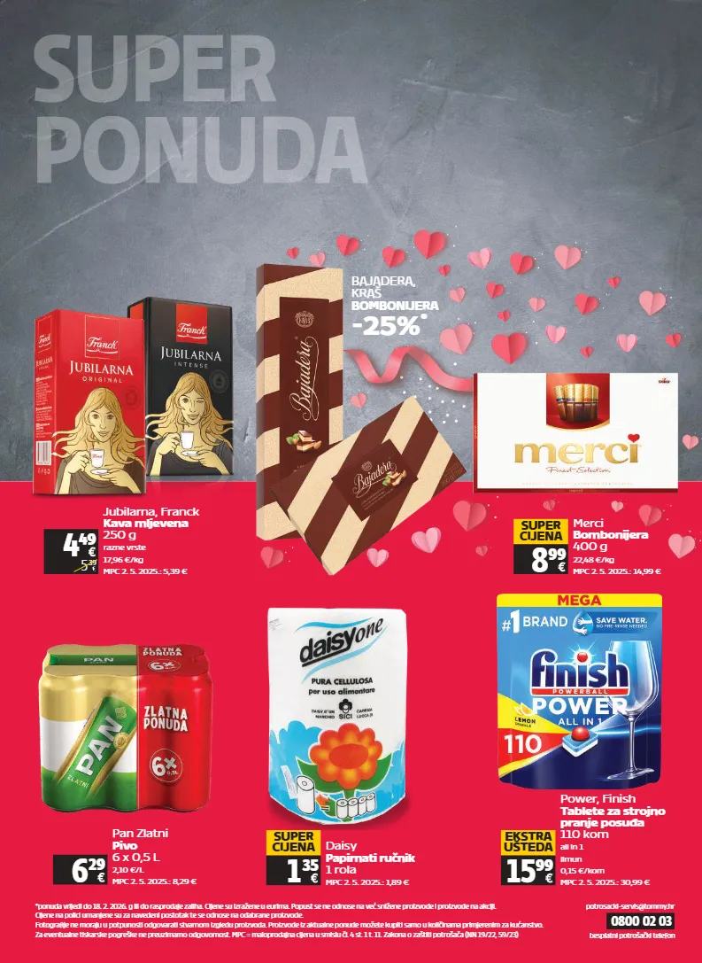 32 ponuda vrijedi od četvrtka 12. 2. 2026. do srijede 18. 2. 2026. 0800 02 03 *ponuda vrijedi do 18. 2. 2026. g ili do rasprodaje zaliha. cijene su izražene u eurima. popust se ne odnose na već snižene proizvode i proizvode na akciji. cijene na polici umanjene su za navedeni postotak te se odnose na odabrane proizvode. fotografije ne moraju u potpunosti odgovarati stvarnom izgledu proizvoda. proizvode iz aktualne ponude možete kupiti samo u količinama primjerenim za kućanstvo. za eventualne tiskarske pogreške ne preuzimamo odgovornost. mpc = maloprodajna cijena u smislu čl. 4 st. 1 t. 11. zakona o zaštiti potrošača (nn 19/22, 59/23) besplatni potrošački telefon potrosacki-servis@tommy.hr super ponuda 4 49 5 39 jubilarna, franck kava mljevena 250 g razne vrste 17,96 €/kg mpc 2. 5. 2025.: 5,39 € merci bombonijera 400 g 22,48 €/kg mpc 2. 5. 2025.: 14,99 € 8 99 super cijena pan zlatni pivo 6 x 0,5 l 2,10 €/l mpc 2. 5. 2025.: 8,29 € 6 29 power, finish tablete za strojno pranje posuđa 110 kom all in 1 limun 0,15 €/kom mpc 2. 5. 2025.: 30,99 € 15 99 ekstra ušteda daisy papirnati ručnik 1 rola mpc 2. 5. 2025.: 1,89 € 1 35 super cijena bajadera, kraš bombonijera -25% *
