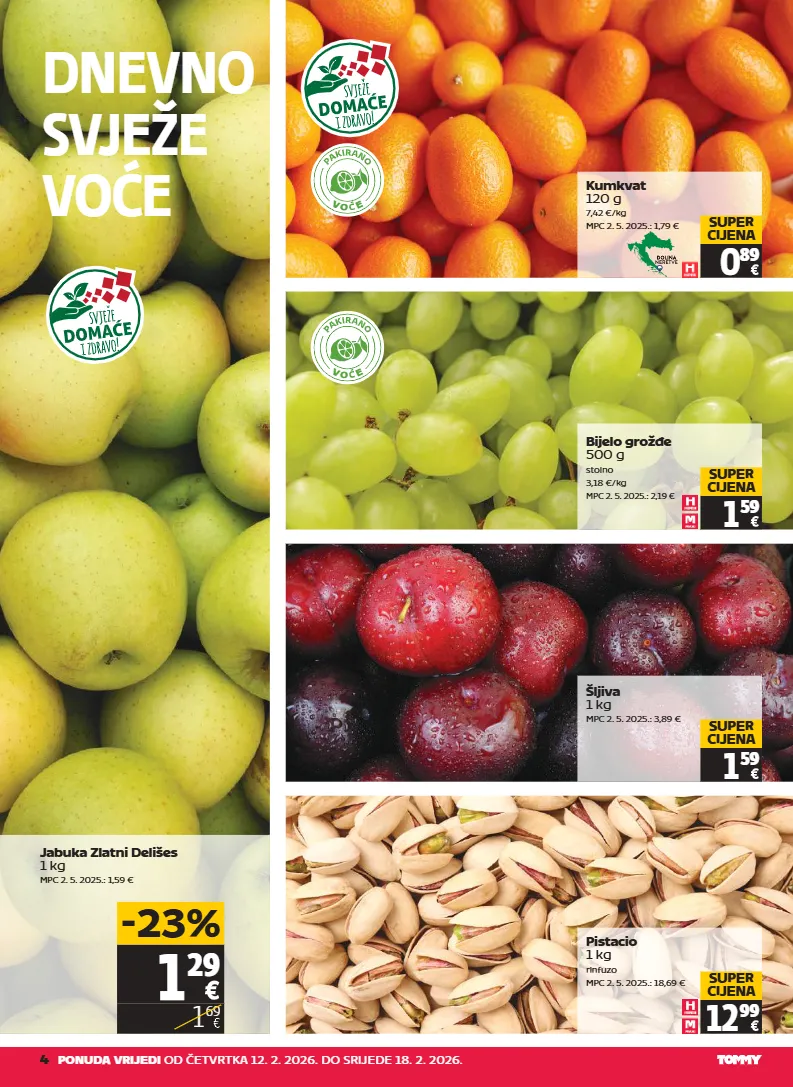 4 ponuda vrijedi od četvrtka 12. 2. 2026. do srijede 18. 2. 2026. dnevno svježe voće kumkvat 120 g 7,42 €/kg mpc 2. 5. 2025.: 1,79 € 0 89 super cijena bijelo grožđe 500 g stolno 3,18 €/kg mpc 2. 5. 2025.: 2,19 € 1 59 super cijena šljiva 1 kg mpc 2. 5. 2025.: 3,89 € 1 59 super cijena pistacio 1 kg rinfuzo mpc 2. 5. 2025.: 18,69 € 12 99 super cijena 1 29 1 69 -23% jabuka zlatni delišes 1 kg mpc 2. 5. 2025.: 1,59 € v o e v o e