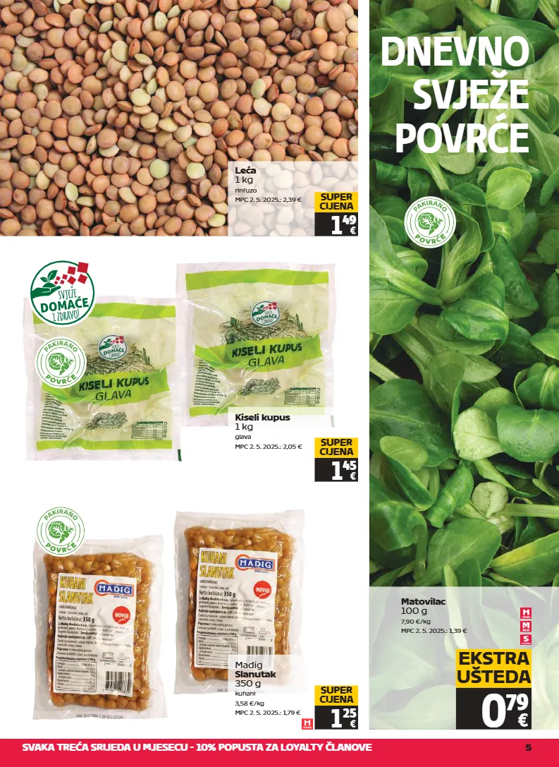 svaka treća srijeda u mjesecu - 10% popusta za loyalty članove 5 dnevno svježe povrće 0 79 ekstra ušteda matovilac 100 g 7,90 €/kg mpc 2. 5. 2025.: 1,39 € kiseli kupus 1 kg glava mpc 2. 5. 2025.: 2,05 € 1 45 super cijena madig slanutak 350 g kuhani 3,58 €/kg mpc 2. 5. 2025.: 1,79 € 1 25 super cijena leća 1 kg rinfuzo mpc 2. 5. 2025.: 2,39 € 1 49 super cijena p o v r e p o v r e p o v r e