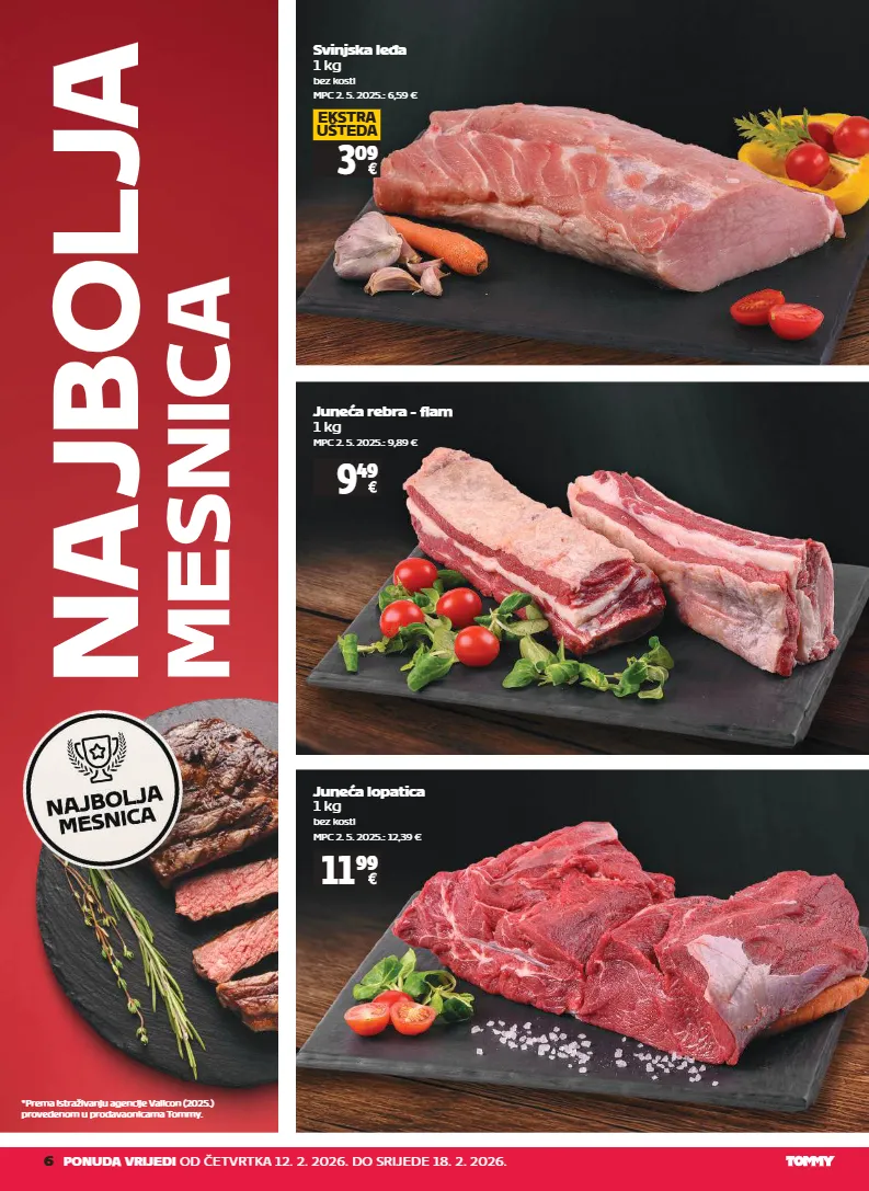 *prema istraživanju agencije valicon (2025.) provedenom u prodavaonicama tommy. 6 ponuda vrijedi od četvrtka 12. 2. 2026. do srijede 18. 2. 2026. svinjska leđa 1 kg bez kosti mpc 2. 5. 2025.: 6,59 € juneća rebra - flam 1 kg mpc 2. 5. 2025.: 9,89 € 3 09 ekstra ušteda 9 49 juneća lopatica 1 kg bez kosti mpc 2. 5. 2025.: 12,39 € 11 99