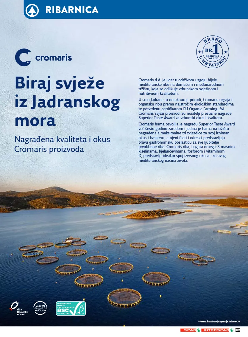 cromaris d.d. je lider u održivom uzgoju bijele mediteranske ribe na domaćem i međunarodnom tržištu, koja se odlikuje vrhunskom svježinom i nutritivnom kvalitetom. u srcu jadrana, u netaknutoj prirodi, cromaris uzgaja i organsku ribu prema najstrožim ekološkim standardima te potvrđenu certifikatom eu organic farming. svi cromaris svježi proizvodi su nositelji prestižne nagrade superior taste award za vrhunski okus i kvalitetu. cromaris hama osvojila je nagradu superior taste award već šestu godinu zaredom i jedina je hama na tržištu nagrađena s maksimalne tri zvjezdice za svoj izniman okus i kvalitetu, a njeni fileti i odresci predstavljaju pravu gastronomsku poslasticu za sve ljubitelje prvoklasne ribe. cromaris riba, bogata omega-3 masnim kiselinama, bjelančevinama, fosforom i vitaminom d, predstavlja idealan spoj izvrsnog okusa i zdravog mediteranskog načina života. biraj svježe iz jadranskog mora nagrađena kvaliteta i okus cromaris proizvoda *prema istraživanju agencije prizma cpi ribarnica
