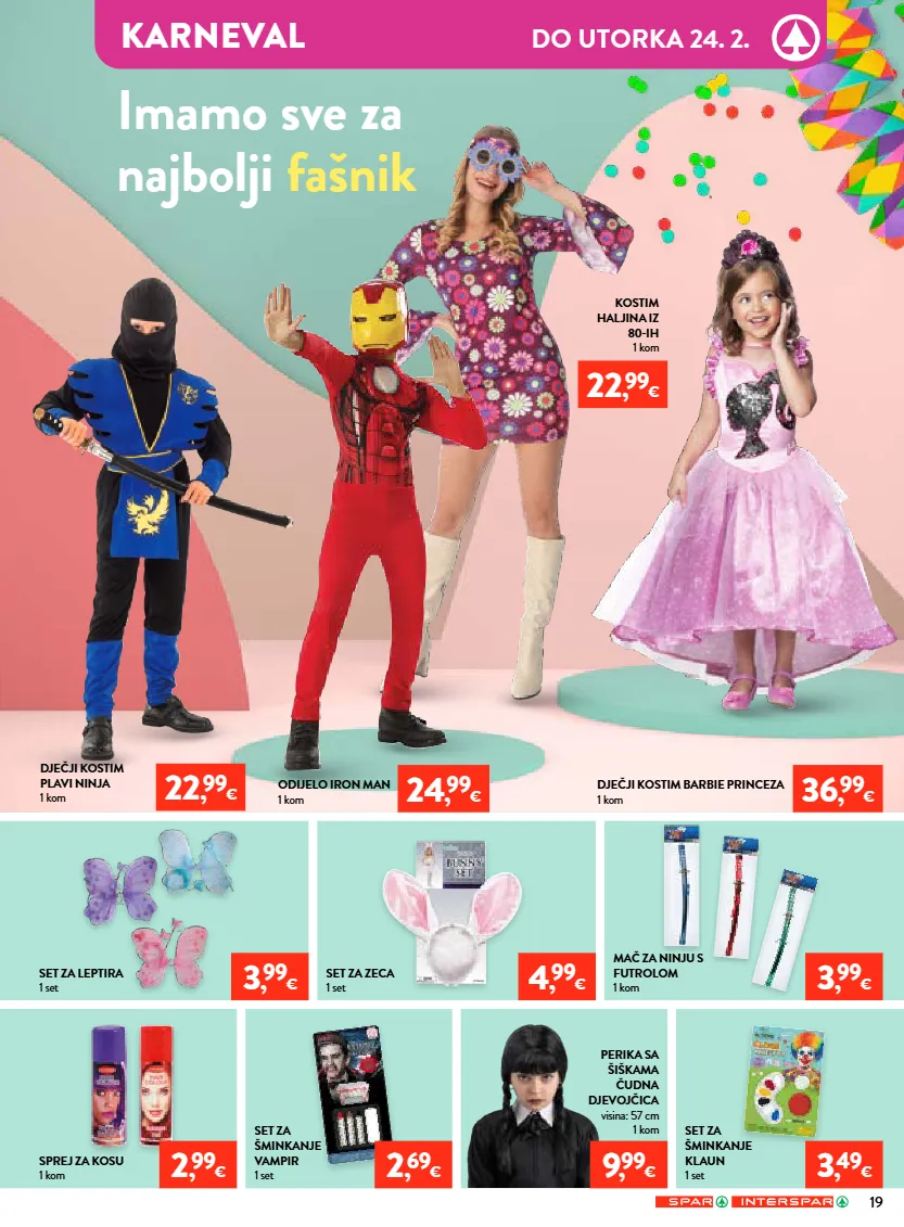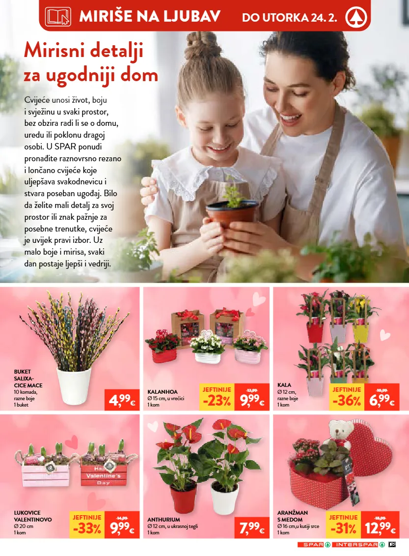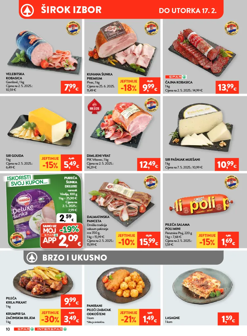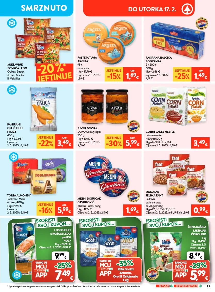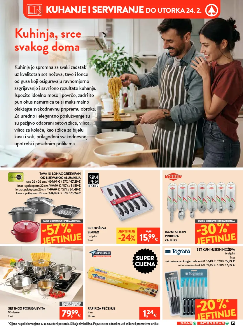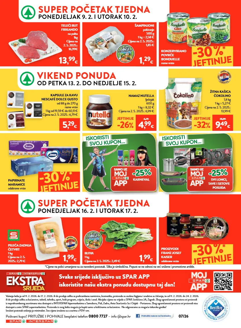 važenje letka je od 11. 2. 2026. do 17. 2. 2026. ili do prodaje zaliha za prehrambene namirnice, kozmetiku, proizvode za osobnu higijenu i sredstva za čišćenje, te od 11. 2. 2026. do 24. 2. 2026. ili do prodaje zaliha za kućanstvo, tekstil, tehniku, sport, hobi program, cvijeće, školu i ured. akcijske cijene ne vrijede u spar jurišićeva 2a, zagreb. zbog ograničenosti prostora svi proizvodi iz neprehrambenog asortimana nisu dostupni u interspar hipermarketima u samoboru, puli, zadru, ante starčevića 5a i osijek - portanova. zbog ograničenosti prostora svi proizvodi nisu dostupni u svim spar supermarketima. proizvode iz ovog letka moguće je kupiti samo u količinama za kućanstvo. ne odgovaramo za moguće tiskarske greške! izraženi postotak sniženja je minimalan. sve cijene izražene su u eurima s pdv-om. poštvani kupci! pritužbe i pohvale besplatni telefon 0800 7727 – info @spar.hr super početak tjedna ponedjeljak 9. 2. i utorak 10. 2. 07/26 super početak tjedna ponedjeljak 16. 2. i utorak 17. 2. *cijene na polici umanjene su za navedeni postotak. slika je simbolična. popust se ne odnosi na već snižene i promotivne artikle. svake srijede isključivo uz spar app iskoristite našu ekstra ponudu dostupnu taj dan! iskoristi svoj kupon... iskoristi svoj kupon... vikend ponuda od petka 13. 2. do nedjelje 15. 2. kapsule za kavu nescafé dolce gusto od 88 g do 270 g razne vrste 1 kg od 19,59 € do 60,11 € cijena na 2. 5. 2025.: 6,79 € pileća zadnja četvrt 1 kg cijena na 2. 5. 2025.: 2,79 € blitva 1 kg cijena na 2. 5. 2025.: 2,49 € namaz nutella lješnjak 600 g 1 kg = 8,32 € cijena na 2. 5. 2025.: 6,99 € žitna kašica čokolino 1,8 kg 1 kg = 5,27 € cijena na 2. 5. 2025.: 13,99 € papirnate maramice odabrane vrste proizvodi franz josef kaiser odabrane vrste samo uz -25% -25% samo uz -25% -25% karneval svi lonci, tave i setove posuđa jeftinije -26 % 6,79 4 , 99 € jeftinije -32 % 13,99 9 , 49 € -30 % * jeftinije -30 % * jeftinije 13 , 99 € 1 , 29 € teleći but frikando na pultu 1kg cijena na 2. 5. 2025.: 16,99€ šampinjoni pakiranje 500 g 1 kg = 2,58 € cijena na 2. 5. 2025.: 1,85 € -30 % * jeftinije konzervirano povrće bonduelle razne vrste 5 , 29 € 1 , 99 € 1 , 99 €