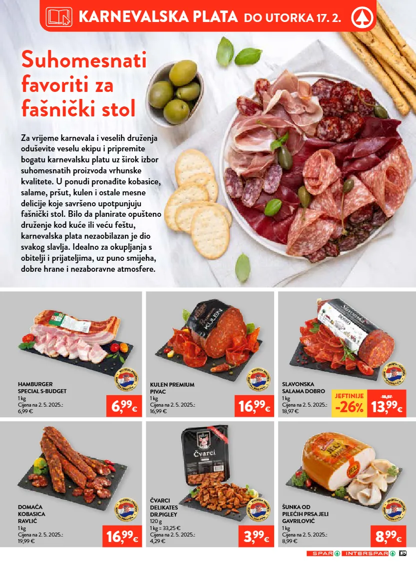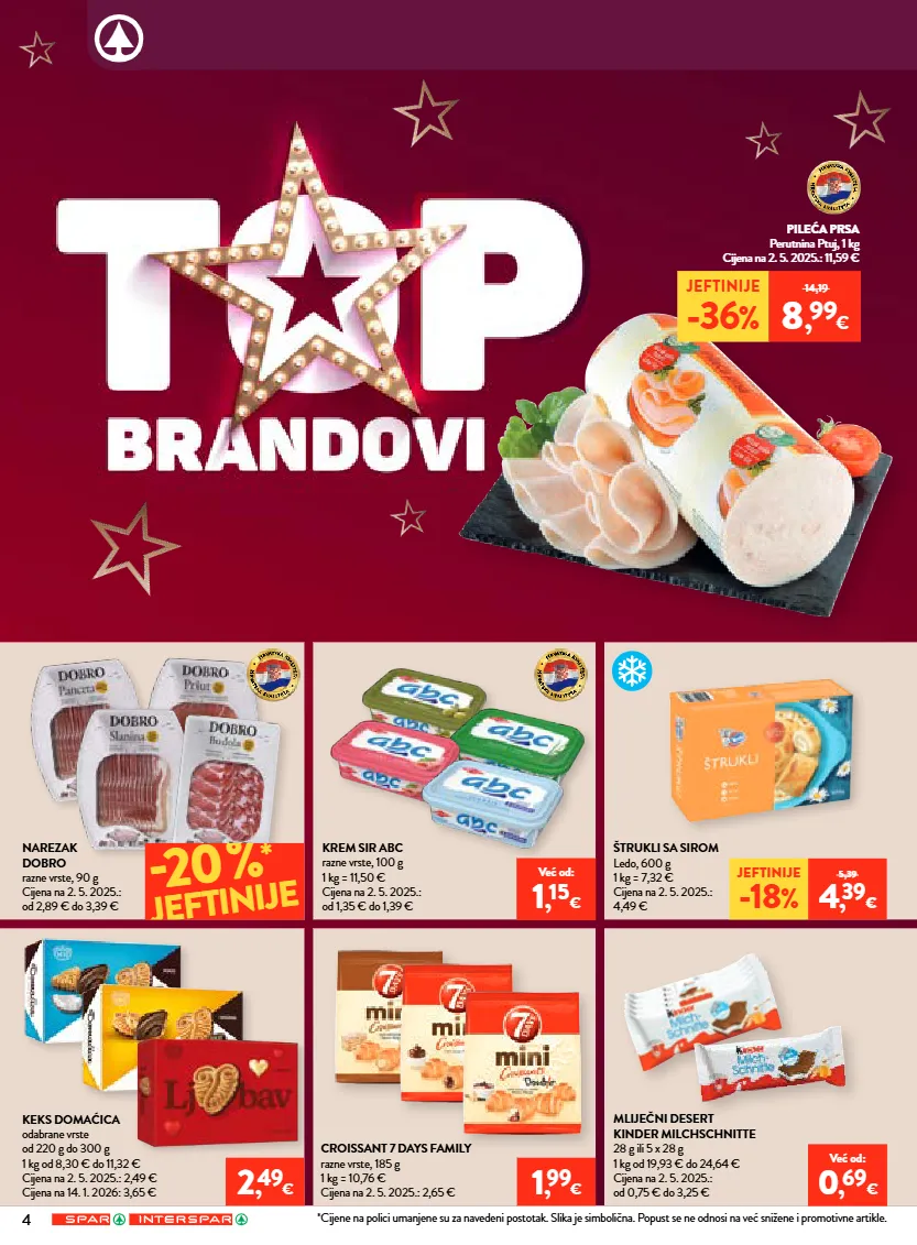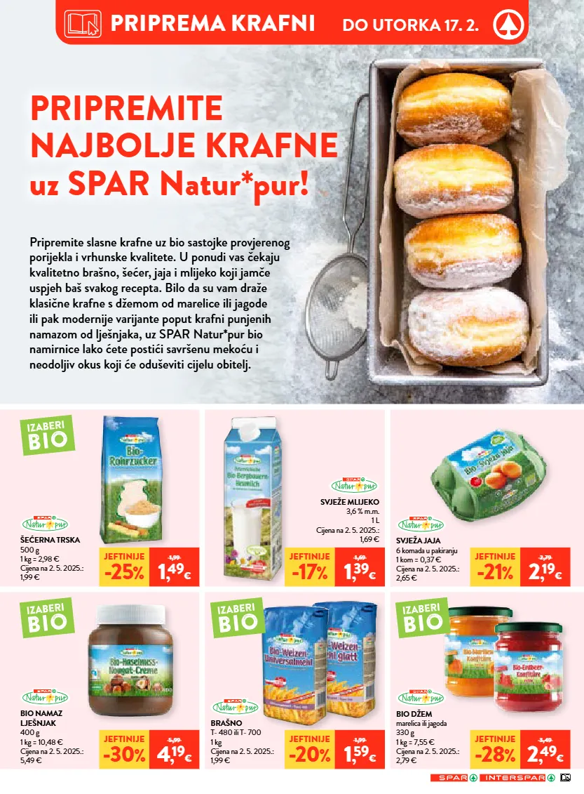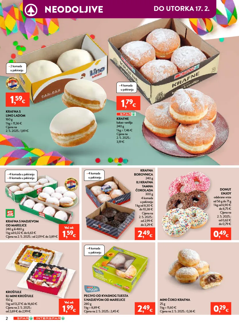 *cijene na polici umanjene su za navedeni postotak. slika je simbolična. popust se ne odnosi na već snižene i promotivne artikle. ruža u celofanu, svježa, visina cca 50 cm 3 , 19 € 1 , 49 € krafna s nadjevom od marelice 12 komada u pakiranju 720 g 1 kg = 4,58 € cijena na 2. 5. 2025.: 3,30 € bomboni kraš odabrane vrste jeftinije -44 % 5,99 3 , 30 € jeftinije -20 % 12,49 9 , 99 € -30 % * jeftinije 24 , 99 € kostim zabavni klaun 1 kom jeftinije -17 % 8,99 8 , 29 € 12 komada u pakiranju 32 role sir varaždinec ili tilzit polutvrdi kravlji vindija 1 kg cijena na 2. 5. 2025.: 12,49 € svinjski vrat bez kosti na pultu 1 kg cijena na 2. 5. 2025.: 4,75 € toaletni papir zewa breskva ili delicate care 3 sloja 32 role u pakiranju 1 rola = 0,26 € cijena na 2. 5. 2025.: 8,49 € još veću ponudu potražite u digitalnom letku na www.spar.hr prijave otvorene novatv.hr/prijava od srijede 11. 2. 2026.