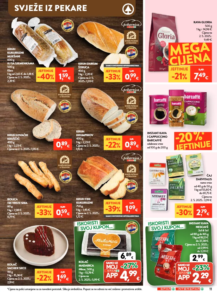 11 *cijene na polici umanjene su za navedeni postotak. slika je simbolična. popust se ne odnosi na već snižene i promotivne artikle. čaj darvitalis razne vrste od 40 g do 50 g 1 kg od 55,80 € do 69,75 € cijena na 2. 5. 2025.: 3,99 € instant kava i cappuccino barcaffé odabrane vrste od 100 g do 200 g mega cijena jeftinije -21 % 9,49 7 , 49 € jeftinije -33 % 0,89 0 , 59 € jeftinije -22 % 1,15 0 , 89 € jeftinije -40 % 2,69 1 , 59 € jeftinije -22 % 2,19 1 , 69 € kava gloria 500 g 1 kg = 14,98 € cijena na 2. 5. 2025.: 9,49 € kruh kukuruzni miješani 600 g ili sa sjemenkama 500 g klara 1 kg od 2,65 € do 3,18 € cijena na 2. 5. 2025.: 2,39 € -20 % * jeftinije kruh lovački kruščić 400 g 1 kg = 2,23 € cijena na 2. 5. 2025.: 1,05 € kruh fini kukuruzni 750 g 1 kg = 1,45 € cijena na 2. 5. 2025.: 1,72 € kolač sacher srce 110 g 1 kg = 15,36 € cijena na 2. 5. 2025.: 2,19 € kruh krumpirov 400 g 1 kg = 2,23 € cijena na 2. 5. 2025.: 1,15 € kruh durum štruca 450 g 1 kg = 2,20 € cijena na 2. 5. 2025.: 1,33 € rolica tri vrste sira 80 g 1 kg = 7,38 € cijena na 2. 5. 2025.: 0,79 € jeftinije -33 % 1,49 0 , 99 € samo u interspar hipermarketima jeftinije -30 % 3,99 2 , 79 € 0 , 89 € jeftinije -39 % 1,79 1 , 09 € samo u interspar hipermarketima svježe iz pekare instant kava nescafé 2u1 ili 3u1 od 80 g do 165 g 1 kg od 18,12 € do 37,38 € cijena na 2. 5. 2025.: od 2,99 € do 3,09 € kolač mađarica mlinar, 500 g 1 kg = 13,78 € cijena na 2. 5. 2025.: 5,99 € 2 , 99 € samo uz 2 , 29 € -23% -23% 6 , 89 € samo uz 4 , 99 € -27% -27% iskoristi svoj kupon... iskoristi svoj kupon...