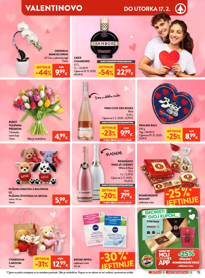 valentinovo do utorka 17. 2. 15 *cijene na polici umanjene su za navedeni postotak. slika je simbolična. popust se ne odnosi na već snižene i promotivne artikle. bombonijere mozart odabrane vrste kreme nivea odabrane vrste 50 ml praline baci 100 g 1 kg = 89,90 € cijena na 19. 12. 2025.: 11,99 € vino cote des roses rose 0,75 l cijena na 2. 5. 2025.: 12,99 € pjenušavo vino jp. chenet white ili rose 1,5 l 1 l = 5,33 € cijena na 2. 5. 2025.: 10,02 € jeftinije -25 % 11,99 8 , 99 € -25 % * jeftinije jeftinije -20 % 10,02 7 , 99 € u cijenu uključena povratna naknada -30 % * jeftinije 4 , 99 € 5 , 99 € jeftinije -44 % 17,99 9 , 99 € jeftinije -54 % 49,99 22 , 99 € jeftinije -31 % 18,99 12 , 99 € cymbidium s medom 1 kom buket tulipana premium 7 komada, razne boje 1 kom orhideja mimesis swan ø 7cm, u ukrasnoj tegli 1 kom liker chambord 0,7 l 1 l = 32,84 € cijena na 25. 11. 2025: 49,99 € plišana igračka s balonom ili plišana životinja sa srcem visina: 14 cm 1 kom samo uz -25% -25% praline i bombonijere kraš odabrane vrste iskoristi svoj kupon... dno u obliku ruže magnum slika je simbolična. jeftinije -23 % 12,99 9 , 99 € u cijenu uključena povratna naknada samo u interspar hipermarketima samo u interspar hipermarketima samo u interspar hipermarketima