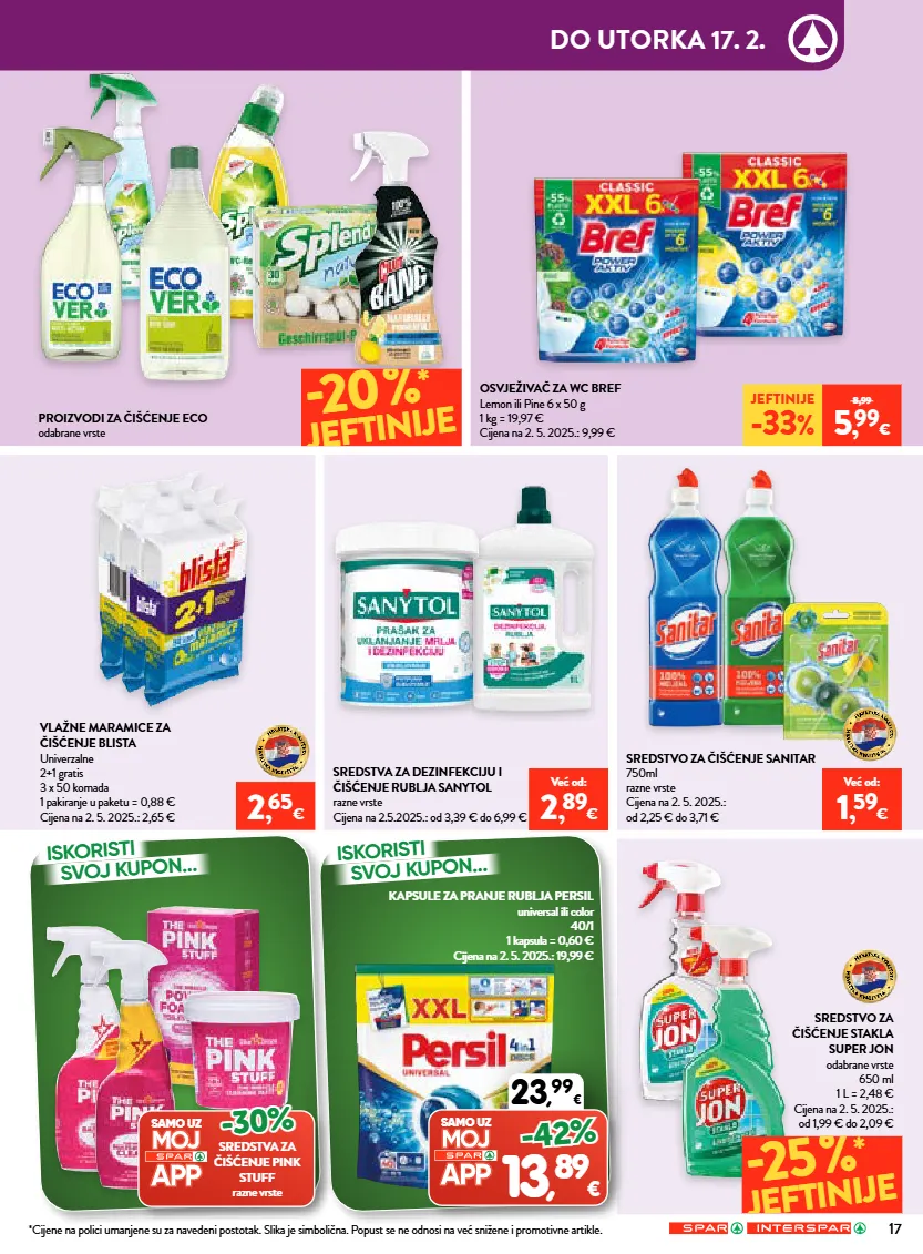 do utorka 17. 2. 17 iskoristi svoj kupon... iskoristi svoj kupon... kapsule za pranje rublja persil universal ili color 40/1 1 kapsula = 0,60 € cijena na 2. 5. 2025.: 19,99 € sredstvo za čišćenje stakla super jon odabrane vrste 650 ml 1 l = 2,48 € cijena na 2. 5. 2025.: od 1,99 € do 2,09 € *cijene na polici umanjene su za navedeni postotak. slika je simbolična. popust se ne odnosi na već snižene i promotivne artikle. 2 , 65 € sredstva za dezinfekciju i čišćenje rublja sanytol razne vrste cijena na 2.5.2025.: od 3,39 € do 6,99 € sredstvo za čišćenje sanitar 750ml razne vrste cijena na 2. 5. 2025.: od 2,25 € do 3,71 € osvježivač za wc bref lemon ili pine 6 x 50 g 1 kg = 19,97 € cijena na 2. 5. 2025.: 9,99 € proizvodi za čišćenje eco odabrane vrste vlažne maramice za čišćenje blista univerzalne 2+1 gratis 3 x 50 komada 1 pakiranje u paketu = 0,88 € cijena na 2. 5. 2025.: 2,65 € već od: 2 , 89 € već od: 1 , 59 € jeftinije -33 % 8,99 5 , 99 € -20 % * jeftinije -25 % * jeftinije samo uz -30% -30% sredstva za čišćenje pink stuff razne vrste 23 , 99 € samo uz 13 , 89 € -42% -42%