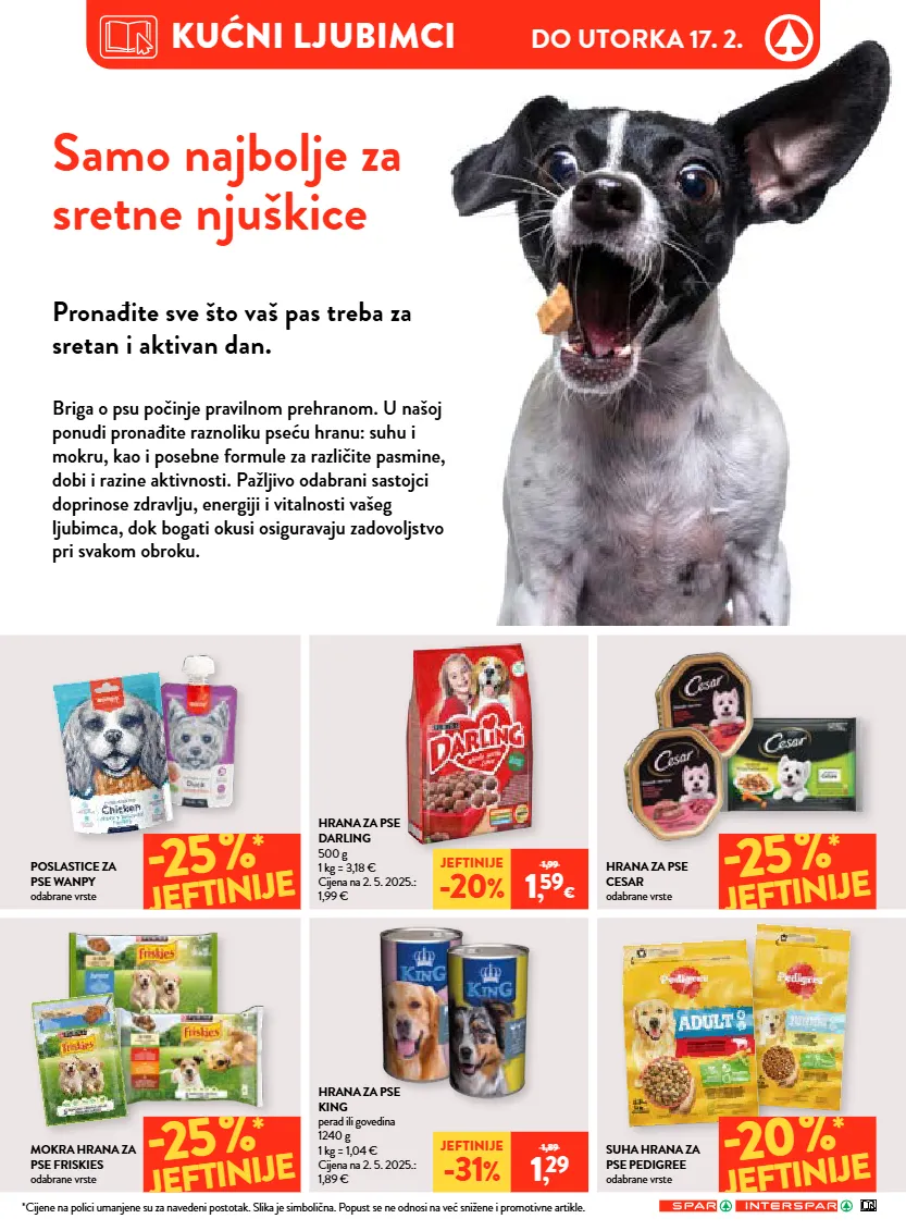 *cijene na polici umanjene su za navedeni postotak. slika je simbolična. popust se ne odnosi na već snižene i promotivne artikle. samo najbolje za sretne njuškice pronađite sve što vaš pas treba za sretan i aktivan dan. briga o psu počinje pravilnom prehranom. u našoj ponudi pronađite raznoliku pseću hranu: suhu i mokru, kao i posebne formule za različite pasmine, dobi i razine aktivnosti. pažljivo odabrani sastojci doprinose zdravlju, energiji i vitalnosti vašeg ljubimca, dok bogati okusi osiguravaju zadovoljstvo pri svakom obroku. do utorka 17. 2. kućni ljubimci hrana za pse cesar odabrane vrste hrana za pse darling 500 g 1 kg = 3,18 € cijena na 2. 5. 2025.: 1,99 € poslastice za pse wanpy odabrane vrste suha hrana za pse pedigree odabrane vrste hrana za pse king perad ili govedina 1240 g 1 kg = 1,04 € cijena na 2. 5. 2025.: 1,89 € mokra hrana za pse friskies odabrane vrste jeftinije -31 % 1,89 1 , 29 jeftinije -20 % 1,99 1 , 59 € -25 % * jeftinije -20 % * jeftinije -25 % * jeftinije -25 % * jeftinije