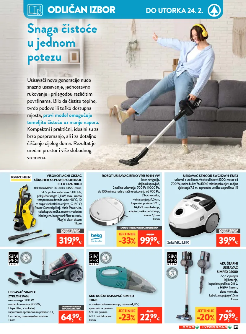 do utorka 24. 2. odličan izbor jeftinije -23 % 29,99 22 , 99 € snaga čistoće u jednom potezu usisavači nove generacije nude snažno usisavanje, jednostavno rukovanje i prilagodbu različitim površinama. bilo da čistite tepihe, tvrde podove ili teško dostupna mjesta, pravi model omogućuje temeljitu čistoću uz manje napora. kompaktni i praktični, idealni su za brzo pospremanje, ali i za detaljno čišćenje cijelog doma. rezultat je uredan prostor i više slobodnog vremena. visokotlačni čistač kärcher k5 power control flex 1.324-700.0 tlak (bar/mpa): 20-maks. 145/2-maks. 14.5, protok vode: max. 500 l/h, priključna snaga: 2,1 kw, max., ulazna temperatura dovoda vode: 40°c, 10 m dugo visokotlačno crijevo, g 160 q power control pištolj, vario power jet, teleskopska ručka, motor s vodenim hlađenjem, integrirani filtar za vodu, plug ‘n’ clean sistem 1 kom usisavač simpex zyklon 21665 usisna snaga: 200 w, snažan eco motor 800 w, hepa filter, 7 m kabel, zapremnina spremnika za prašinu: 3 l, eco četka, usisavanje bez vrećice 1 kom aku ručni usisavač simpex 33078 za mokro i suho usisavanje, baterija 4,8 v, spremnik za prašinu: 450 ml prašine ili 100 ml tekućine 1 kom aku štapni usisavač simpex 33080 22,2 v punjiva litij baterija, kapacitet prašine: 0,8 l, s hepa filtrom, zidna montaža, kabel za napajanje 1,5 m 1 kom robot usisavač beko vrr 50414 vw laser navigacija, daljinski upravljač, 2 načina usisavanja: 700 pa i 1000 pa, do 100 minuta rada u načinu usisavanja od 700 pa, 2 bočne četke, visina penjanja 1,5 cm, kapacitet prašine 0,2 l, 14,4v li-ion baterija, adapter, četka za čišćenje, visina 7,6 cm 1 kom usisavač sencor swc 52wh-eue3 usisavač s vrećicom, visoko učinkovit eco motor od 700 w, razina buke: 76 db(a) teleskopska cijev, radijus djelovanja 7,5 m, zapremina vrećice za prašinu: 1,5 jeftinije -33 % 149,99 99 , 99 € samo u interspar hipermarketima jeftinije -20 % 99,99 79 , 99 € samo u interspar hipermarketima 39 , 99 € samo u interspar hipermarketima 319 , 99 € samo u interspar hipermarketima 64 , 99 €