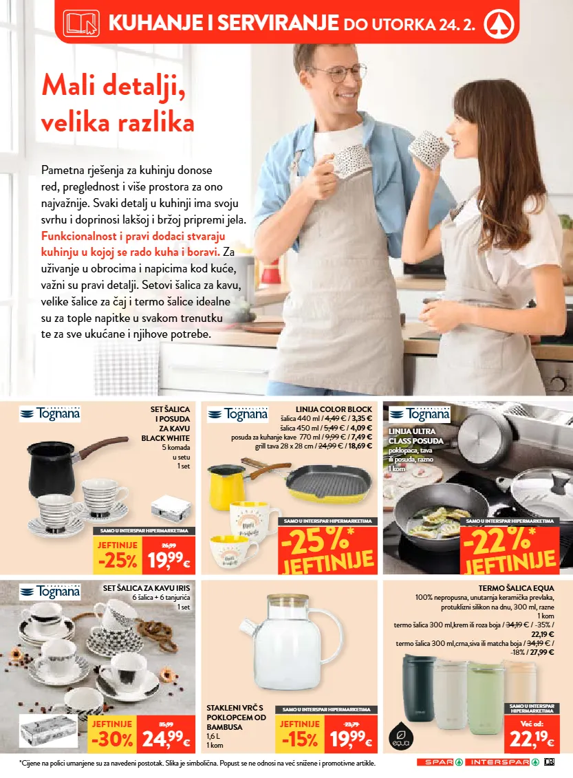 *cijene na polici umanjene su za navedeni postotak. slika je simbolična. popust se ne odnosi na već snižene i promotivne artikle. pametna rješenja za kuhinju donose red, preglednost i više prostora za ono najvažnije. svaki detalj u kuhinji ima svoju svrhu i doprinosi lakšoj i bržoj pripremi jela. funkcionalnost i pravi dodaci stvaraju kuhinju u kojoj se rado kuha i boravi. za uživanje u obrocima i napicima kod kuće, važni su pravi detalji. setovi šalica za kavu, velike šalice za čaj i termo šalice idealne su za tople napitke u svakom trenutku te za sve ukućane i njihove potrebe. linija ultra class posuđa poklopaca, tava ili posuda, razno 1 kom termo šalica equa 100% nepropusna, unutarnja keramička prevlaka, protuklizni silikon na dnu, 300 ml, razne 1 kom termo šalica 300 ml,krem ili roza boja / 34,19 € / -35% / 22,19 € termo šalica 300 ml,crna,siva ili matcha boja / 34,19 € / -18% / 27,99 € set š alica za kavu iris 6 šalica + 6 tanjurića 1 set set šalica i posuda za kavu black white 5 komada u setu 1 set mali detalji, velika razlika stakleni vrč s poklopcem od bambusa 1,6 l 1 kom jeftinije -15 % 23,79 19 , 99 € samo u interspar hipermarketima -22 % * jeftinije samo u interspar hipermarketima -25 % * jeftinije samo u interspar hipermarketima linija color block šalica 440 ml / 4,49 € / 3,35 € šalica 450 ml / 5,49 € / 4,09 € posuda za kuhanje kave 770 ml / 9,99 € / 7,49 € grill tava 28 x 28 cm / 24,99 € / 18,69 € jeftinije -30 % 35,99 24 , 99 € jeftinije -25 % 26,99 19 , 99 € samo u interspar hipermarketima samo u interspar hipermarketima već od: 22 , 19 € do utorka 24. 2. kuhanje i serviranje