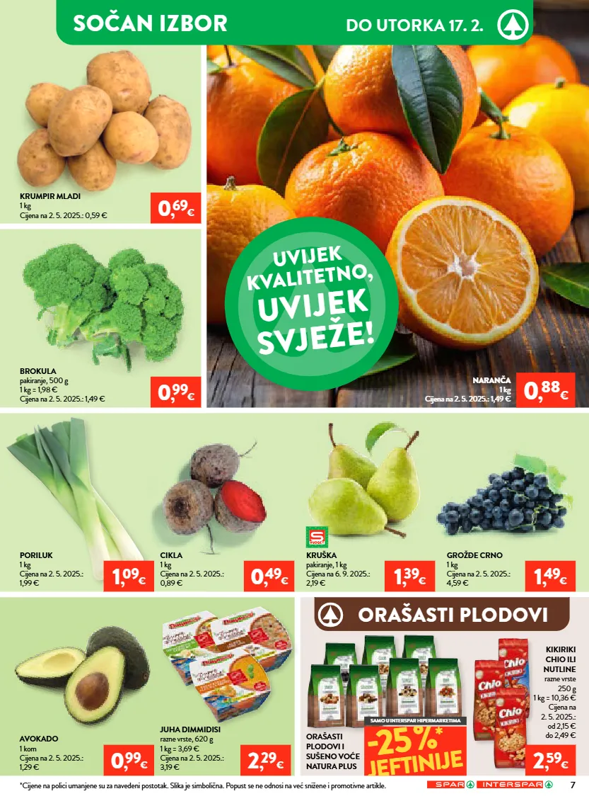 7 poriluk 1 kg cijena na 2. 5. 2025.: 1,99 € 1 , 09 € 2 , 29 € juha dimmidisi razne vrste, 620 g 1 kg = 3,69 € cijena na 2. 5. 2025.: 3,19 € brokula pakiranje, 500 g 1 kg = 1,98 € cijena na 2. 5. 2025.: 1,49 € 0 , 99 € krumpir mladi 1 kg cijena na 2. 5. 2025.: 0,59 € 0 , 69 € grožđe crno 1 kg cijena na 2. 5. 2025.: 4,59 € 1 , 49 € avokado 1 kom cijena na 2. 5. 2025.: 1,29 € 0 , 99 € 2 , 59 € naranča 1 kg cijena na 2. 5. 2025.: 1,49 € 0 , 88 € kikiriki chio ili nutline razne vrste 250 g 1 kg = 10,36 € cijena na 2. 5. 2025.: od 2,15 € do 2,49 € orašasti plodovi i sušeno voće natura plus kruška pakiranje, 1 kg cijena na 6. 9. 2025.: 2,19 € 1 , 39 € cikla 1 kg cijena na 2. 5. 2025.: 0,89 € 0 , 49 € uvijek kvalitetno, uvijek svježe ! -25 % * jeftinije samo u interspar hipermarketima do utorka 17. 2. sočan izbor *cijene na polici umanjene su za navedeni postotak. slika je simbolična. popust se ne odnosi na već snižene i promotivne artikle. orašasti plodovi