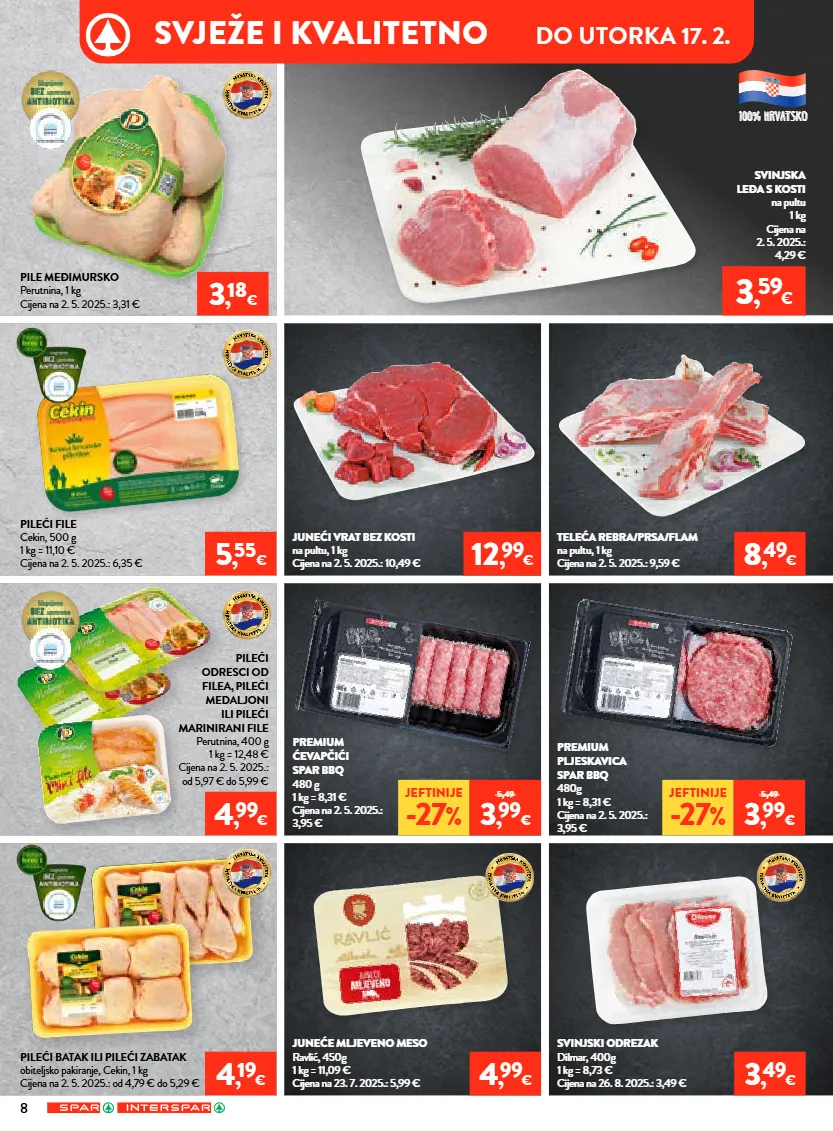 8 pileći file cekin, 500 g 1 kg = 11,10 € cijena na 2. 5. 2025.: 6,35 € 5 , 55 € premium ćevapčići spar bbq 480 g 1 kg = 8,31 € cijena na 2. 5. 2025.: 3,95 € premium pljeskavica spar bbq 480g 1 kg = 8,31 € cijena na 2. 5. 2025.: 3,95 € teleća rebra/prsa/flam na pultu, 1 kg cijena na 2. 5. 2025.: 9,59 € 8 , 49 € juneći vrat bez kosti na pultu, 1 kg cijena na 2. 5. 2025.: 10,49 € 12 , 99 € pile međimursko perutnina, 1 kg cijena na 2. 5. 2025.: 3,31 € 3 , 18 € juneće mljeveno meso ravlić, 450g 1 kg = 11,09 € cijena na 23. 7. 2025.: 5,99 € 4 , 99 € svinjski odrezak dilmar, 400g 1 kg = 8,73 € cijena na 26. 8. 2025.: 3,49 € 3 , 49 € pileći batak ili pileći zabatak obiteljsko pakiranje, cekin, 1 kg cijena na 2. 5. 2025.: od 4,79 € do 5,29 € 4 , 19 € pileći odresci od filea, pileći medaljoni ili pileći marinirani file perutnina, 400 g 1 kg = 12,48 € cijena na 2. 5. 2025.: od 5,97 € do 5,99 € 4 , 99 € 100% hrvatsko 3 , 59 € svinjska leđa s kosti na pultu 1 kg cijena na 2. 5. 2025.: 4,29 € jeftinije -27 % 5,49 3 , 99 € jeftinije -27 % 5,49 3 , 99 € do utorka 17. 2. svježe i kvalitetno