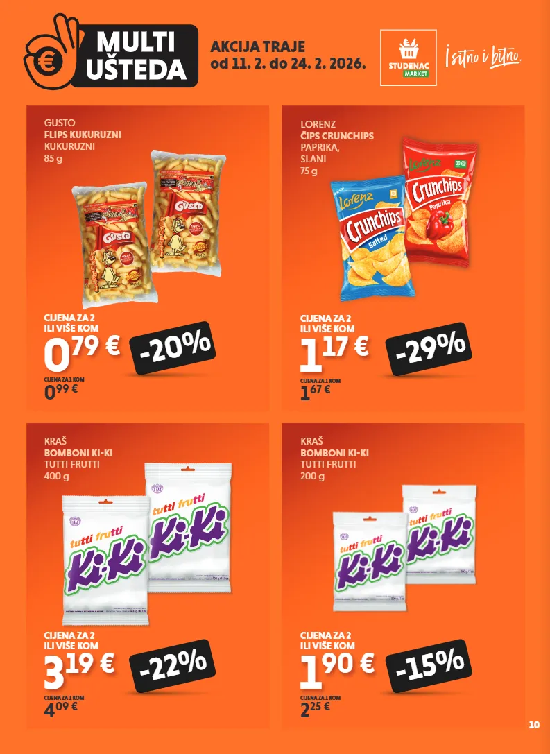 akcija traje od 11. 2. do 24. 2. 2026. kraš bomboni ki-ki tutti frutti 400 g 3 19 € 4 09 € cijena za 1 kom -22% cijena za 2 ili više kom kraš bomboni ki-ki tutti frutti 200 g 1 90 € 2 25 € cijena za 1 kom -15% cijena za 2 ili više kom gusto flips kukuruzni kukuruzni 85 g 0 79 € 0 99 € cijena za 1 kom -20% cijena za 2 ili više kom lorenz čips crunchips paprika, slani 75 g 1 17 € 1 67 € cijena za 1 kom -29% cijena za 2 ili više kom 10