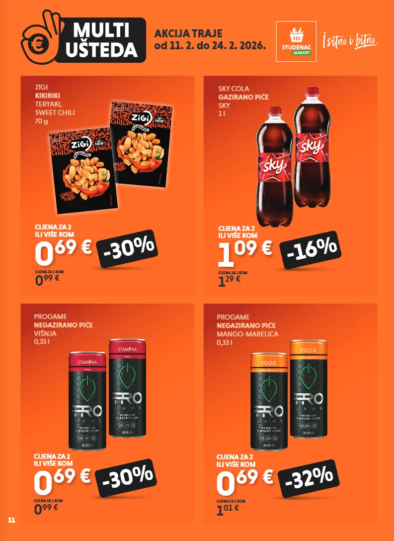 akcija traje od 11. 2. do 24. 2. 2026. zigi kikiriki teryaki, sweet chili 70 g 0 69 € 0 99 € cijena za 1 kom -30% cijena za 2 ili više kom progame negazirano piće višnja 0,33 l 0 69 € 0 99 € cijena za 1 kom -30% cijena za 2 ili više kom progame negazirano piće mango-marelica 0,33 l 0 69 € 1 01 € cijena za 1 kom -32% cijena za 2 ili više kom sky cola gazirano piće sky 1 l 1 09 € 1 29 € cijena za 1 kom -16% cijena za 2 ili više kom 11