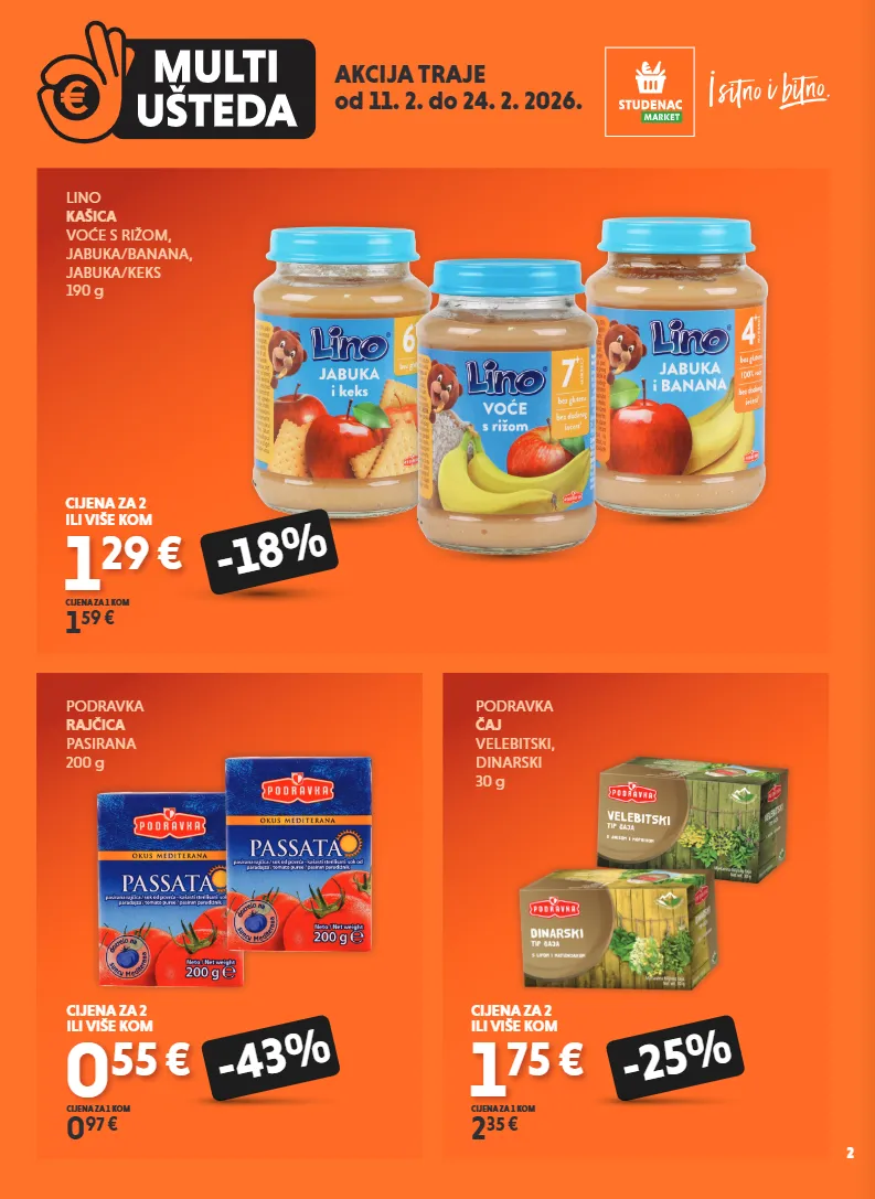 akcija traje od 11. 2. do 24. 2. 2026. lino kašica voće s rižom, jabuka/banana, jabuka/keks 190 g 1 29 € 1 59 € cijena za 2 ili više kom cijena za 1 kom -18% podravka rajčica pasirana 200 g 0 55 € 0 97 € cijena za 1 kom -43% cijena za 2 ili više kom 1 75 € 2 35 € cijena za 1 kom -25% cijena za 2 ili više kom podravka čaj velebitski, dinarski 30 g 2