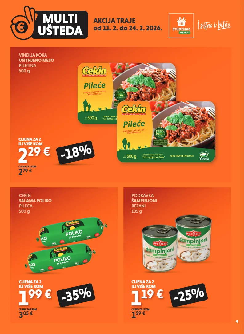 AKCIJA TRAJE od 11. 2. do 24. 2. 2026. VINDIJA KOKA USITNJENO MESO PILETINA 500 g 2 29 € 2 79 € CIJENA ZA 1 KOM -18% CIJENA ZA 2 ILI VIŠE KOM CEKIN SALAMA POLIKO PILEĆA 500 g 1 99 € 3 05 € CIJENA ZA 1 KOM -35% CIJENA ZA 2 ILI VIŠE KOM PODRAVKA ŠAMPINJONI REZANI 105 g 1 19 € 1 59 € CIJENA ZA 1 KOM -25% CIJENA ZA 2 ILI VIŠE KOM 4