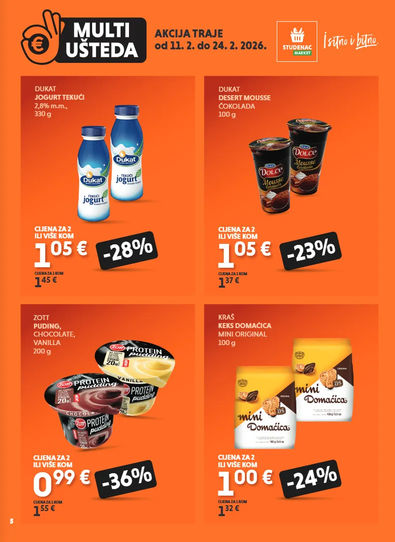 akcija traje od 11. 2. do 24. 2. 2026. dukat jogurt tekući 2,8% m.m., 330 g 1 05 € 1 45 € cijena za 1 kom -28% cijena za 2 ili više kom dukat desert mousse čokolada 100 g 1 05 € 1 37 € cijena za 1 kom -23% cijena za 2 ili više kom kraš keks domaćica mini original 100 g 1 00 € 1 32 € cijena za 1 kom -24% cijena za 2 ili više kom zott puding, chocolate, vanilla 200 g 0 99 € 1 55 € cijena za 1 kom -36% cijena za 2 ili više kom 5