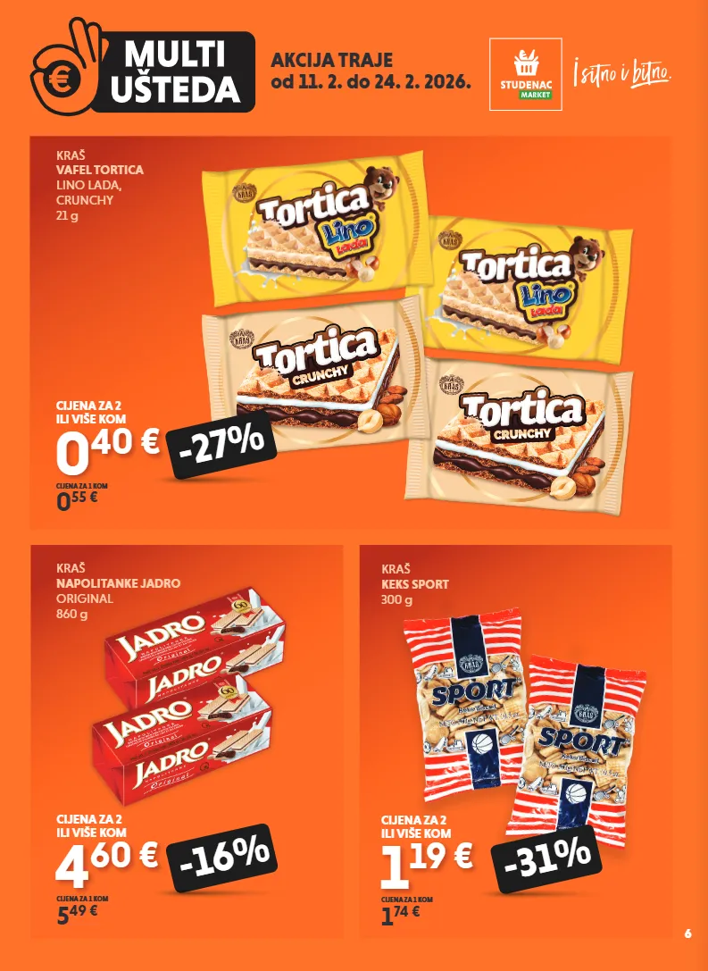 akcija traje od 11. 2. do 24. 2. 2026. kraš vafel tortica lino lada, crunchy 21 g 0 40 € 0 55 € cijena za 1 kom cijena za 2 ili više kom kraš napolitanke jadro original 860 g 4 60 € 5 49 € cijena za 1 kom -16% cijena za 2 ili više kom -27% 1 19 € 1 74 € cijena za 1 kom cijena za 2 ili više kom -31% 6 kraš keks sport 300 g