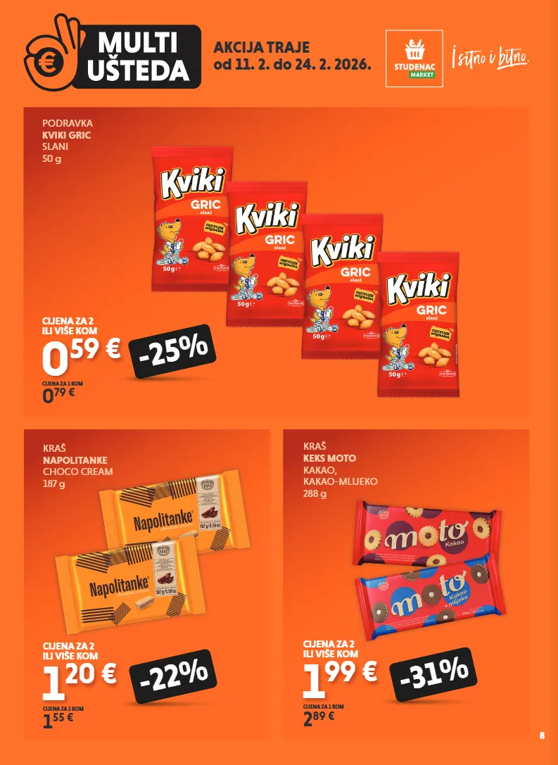 akcija traje od 11. 2. do 24. 2. 2026. 8 podravka kviki gric slani 50 g 0 59 € 0 79 € cijena za 1 kom -25% cijena za 2 ili više kom kraš keks moto kakao, kakao-mlijeko 288 g 1 99 € 2 89 € cijena za 1 kom -31% cijena za 2 ili više kom kraš napolitanke choco cream 187 g 1 20 € 1 55 € cijena za 1 kom -22% cijena za 2 ili više kom