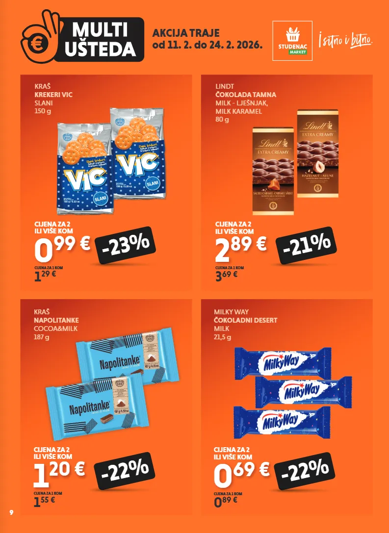 akcija traje od 11. 2. do 24. 2. 2026. 9 lindt čokolada tamna milk - lješnjak, milk karamel 80 g 2 89 € 3 69 € cijena za 1 kom -21% cijena za 2 ili više kom kraš krekeri vic slani 150 g 0 99 € 1 29 € cijena za 1 kom -23% cijena za 2 ili više kom kraš napolitanke cocoa&milk 187 g 1 20 € 1 55 € cijena za 1 kom -22% cijena za 2 ili više kom milky way čokoladni desert milk 21,5 g 0 69 € 0 89 € cijena za 1 kom -22% cijena za 2 ili više kom