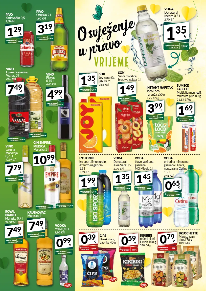 voda donatural menta 0,5 l 2,70 €/l 1 35 € cijena na datum 2.05.2025. 2,09 € osvježenje u pravo vrijeme sok joy naranča, jabuka 2 l 0,68 €/l 1 35 € cijena na datum 02.05.2025. 1,89 € sok vindi marelica, breskva nektar 1 l 1 49 € cijena na datum 02.05.2025. 2,15 € šumeće tablete multivita magnezij, multivita plus 80 g 21,13 €/kg 1 69 € cijena na datum 16.10.2025. 2,29 € voda donatural aloe vera 0,5 l 2,70 €/l 1 35 € cijena na datum 25.06.2025. 2,09 € 7 49 € vino epsko graševina, vranac 3 l 2,50 €/l 3 19 € pivo ožujsko 2 l 1,60 €/l cijena na datum 02.05.2025. 4,02 € cijena na datum 02.05.2025. 10,99 € cijena na datum 02.05.2025. 10,85 € 7 49 € kruškovac maraska 1 l cijena na datum 02.05.2025. 10,02 € 0 99 € vodka yolo 0,10 l 9,90 €/l cijena na datum 02.05.2025. 1,33 € 0 79 € bruschette maretti razni okusi 70 g 11,29 €/kg cijena na datum 02.05.2025. 1,05 € 0 39 € čips hrusk slani, paprika 40 g cijena na datum 02.05.2025. 0,69 € 10 99 € gin empire, medica maraska 1 l cijena na datum 02.05.2025. 14,02 € cijena na datum 02.05.2025. 14,82 € ntl robna marka ntl robna marka 7 49 € royal brand maraska 0,7 l 10,70 €/l cijena na datum 02.05.2025. 9,22 € 1 29 € pivo karlovačko 0,5 l 2,58 €/l cijena na datum 02.05.2025. 1,80 € 7 79 € vino laguna malvazija 0,75 l 10,39 €/l cijena na datum 02.05.2025. 9,92 € izotonik iso sport limun grejp, azzurro negazirani 1,5 l 1,33 €/l 1 99 € cijena na datum 02.05.2025. 2,99 € 0 59 € kikiriki prženi slani hrusk 100 g 5,90 €/kg cijena na datum 02.05.2025. 1,09 € ntl robna marka voda prirodna mineralna gazirana dinara, negazirana cetina 1,5 l 0,43 €/l 0 65 € cijena na datum 02.05.2025. 0,88 € voda blago gazirana, gazirana mg mivela 1 l 1 45 € cijena na datum 02.05.2025. 1,99 € instant napitak toco loco naranča 550 g 7,25 €/kg 3 99 € cijena na datum 02.05.2025. 5,79 € 4 99 € vino plavac 0,75 l 6,65 €/l cijena na datum 02.05.2025. 7,02 €
