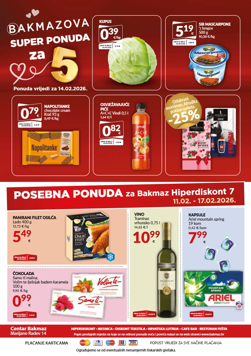 ponuda vrijedi za 14.02.2026. kapsule macchiato, cappuccino franck 198 g 161,56 kn/kg 21,44 €/kg 31 99 kn 4,25 € plaćanje karticama ograđujemo se od eventualnih nenamjernih tiskarskih grešaka. popust vrijedi za sve načine plaćanja centar bakmaz marijane radev 14 hiperdiskont • mesnica • diskont tekstila • hrvatska lutrija • cafe bar - restoran fešta popis prodajnih mjesta na koje se ne odnosi ponuda voća i povrća nalazi se na web stranici www.bakmaz.hr 11.02. - 17.02.2026. posebna ponuda za bakmaz hiperdiskont 7 osvježavajuće piće a+c+e vindi 0,5 l 1,64 €/l 0 82 € cijena na datum 02.05.2025. 1,05 € napolitanke chocolate cream kraš 93 g 8,49 €/kg 0 79 € cijena na datum 02.05.2025. 1,19 € kapsule ariel mountain spring 19 kom 0,42 €/kom 7 99 € cijena na datum 19.05.2025. 15,99 € cijena na datum 02.05.2025. 6,59 € panirani filet osilća ledo 400 g 13,73 €/kg 5 49 € cijena na datum 02.05.2025. 1,45 € čokolada samo ti malina, volim te lješnjak badem karamela 100 g 9,90 €/kg 0 99 € odabrani asortiman afrodita poklon paketa -25% 10 99 € vino traminac vrhunsko 0,75 l 14,65 €/l cijena na datum 02.05.2025. 14,49 € kupus 0 39 €/kg cijena na datum 02.05.2025. 0,79 € sir mascarpone 'z bregov 500 g 10,38 €/kg 5 19 € cijena na datum 02.05.2025. 6,89 € b a k m a z o va super ponuda za