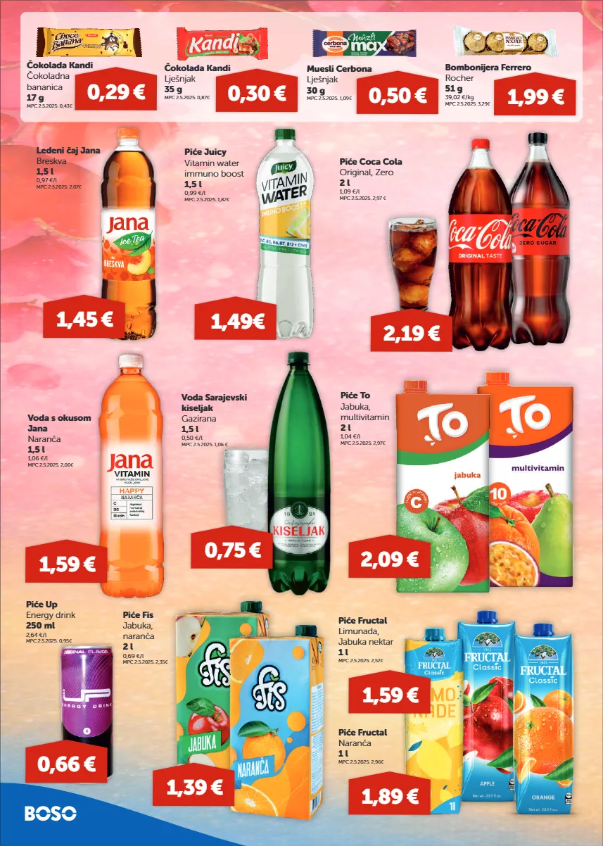 piće fructal limunada, jabuka nektar 1 l mpc 2.5.2025. 2,52€ 1,59 € piće fructal naranča 1 l mpc 2.5.2025. 2,96€ 1,89 € piće juicy vitamin water immuno boost 1,5 l 0,99 €/l mpc 2.5.2025. 1,82€ 1,49€ piće to jabuka, multivitamin 2 l 1,04 €/l mpc 2.5.2025. 2,97€ piće coca cola original, zero 2 l 1,09 €/l mpc 2.5.2025. 2,97 € piće fis jabuka, naranča 2 l 0,69 €/l mpc 2.5.2025. 2,35€ ledeni čaj jana breskva 1,5 l 0,97 €/l mpc 2.5.2025. 2,07€ voda sarajevski kiseljak gazirana 1,5 l 0,50 €/l mpc 2.5.2025. 1,06 € 0,75 € voda s okusom jana naranča 1,5 l 1,06 €/l mpc 2.5.2025. 2,00€ 1,59 € piće up energy drink 250 ml 2,64 €/l mpc 2.5.2025. 0,95€ 0,66 € 1,45 € 2,09 € 1,39 € 2,19 € bombonijera ferrero rocher 51 g 39,02 €/kg mpc 2.5.2025. 3,29€ čokolada kandi lješnjak 35 g mpc 2.5.2025. 0,87€ čokolada kandi čokoladna bananica 17 g mpc 2.5.2025. 0,43€ 0,30 € muesli cerbona lješnjak 30 g mpc 2.5.2025. 1,09€ 0,50 € 0,29 € 1,99 €
