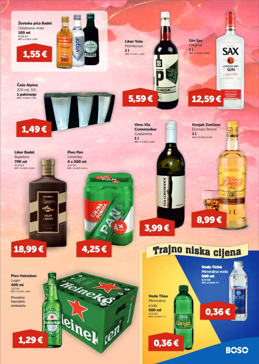 konjak zvečevo domaći brend 1 l mpc 2.5.2025. 12,78€ 8,99 € pivo heineken lager 400 ml 3,23 €/l mpc 2.5.2025. 2,06€ povratna kaucijska ambalaža 1,29 € pivo pan limenka 4 x 500 ml 2,12 €/l mpc 2.5.2025. 6,24 € 4,25 € liker badel bajadera 700 ml 27,13 €/l mpc 2.5.2025. 23,67€ 18,99 € gin sax original 1 l mpc 2.5.2025. 18,90€ 12,59 € žestoka pića badel odabrane vrste 100 ml 15,50 €/l mpc 2.5.2025. 2,04€ 1,55 € vino via commodus graševina 1 l mpc 2.5.2025. 5,05€ 3,99 € liker yolo pelinkovac 1 l mpc 2.5.2025. 9,55€ 5,59 € 0,36 € voda tilea mineralna voda 500 ml 0,72 €/l mpc 2.5.2025. ? € voda tichė mineralna voda 500 ml 0,72 €/l mpc 2.5.2025. ? € 0,36 € čaše alpina 220 ml, 3/1 1 pakiranje mpc 2.5.2025. 3,29€ 1,49 €