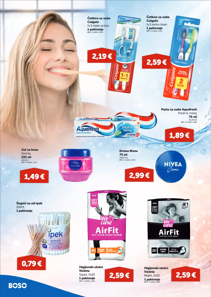 krema nivea 75 ml 39,87 €/l mpc 2.5.2025. 3,59 € 2,99 € pasta za zube aquafresh fresh & minty 75 ml 25,20 €/l mpc 2.5.2025. 2,96€ 1,89 € četkice za zube colgate 1+1 extra clean 1 pakiranje mpc 2.5.2025. 3,73€ 2,59 € četkice za zube colgate 1+1 triple action 1 pakiranje mpc 2.5.2025. 3,29€ 2,19 € gel za kosu strong 225 ml 6,62 €/l mpc 2.5.2025. 2,19 € 1,49 € štapići za uši ipek 100/1 1 pakiranje 0,79 € higijenski ulošci violeta night, 2x10 1 pakiranje mpc 2.5.2025. 3,99€ 2,59 € higijenski ulošci violeta super, 2x10 1 pakiranje mpc 2.5.2025. 2,79€ 2,59 €