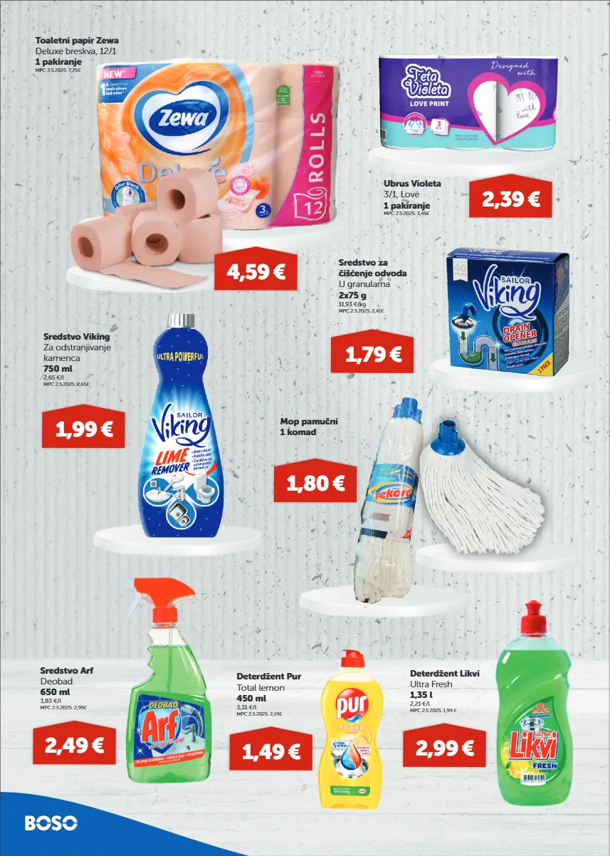 toaletni papir zewa deluxe breskva, 12/1 1 pakiranje mpc 2.5.2025. 7,25€ 4,59 € sredstvo viking za odstranjivanje kamenca 750 ml 2,65 €/l mpc 2.5.2025. 2,65€ 1,99 € sredstvo za čišćenje odvoda u granulama 2x75 g 11,93 €/kg mpc 2.5.2025. 2,41€ 1,79 € sredstvo arf deobad 650 ml 3,83 €/l mpc 2.5.2025. 2,99€ 2,49 € ubrus violeta 3/1, love 1 pakiranje mpc 2.5.2025. 3,45€ 2,39 € mop pamučni 1 komad 1,80 € deterdžent likvi ultra fresh 1,35 l 2,21 €/l mpc 2.5.2025. 1,99 € 2,99 € deterdžent pur total lemon 450 ml 3,31 €/l mpc 2.5.2025. 2,19€ 1,49 €