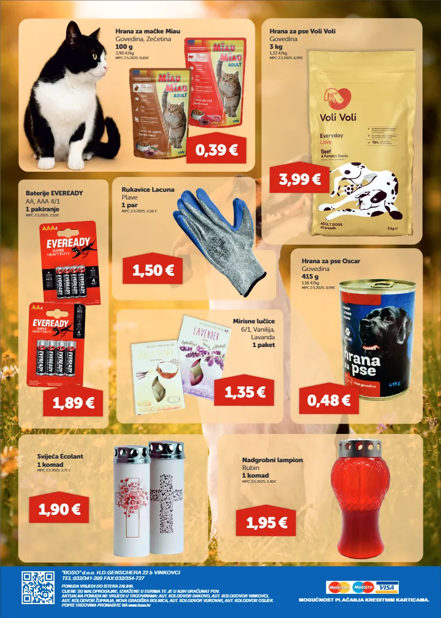 mogućnost plaćanja kreditnim karticama. “boso” d.o.o. h.d.genschera 22 b vinkovci tel:032/341-200 fax:032/354-727 ponuda vrijedi do isteka zaliha. cijene su maloprodajne, izražene u eurima te je u njih uračunat pdv. aktualna ponuda ne vrijedi u trgovinama: aut. kolodvor đakovo, aut. kolodovor vinkovci, aut. kolodvor županja, nova gradiška bolnica, aut. kolodvor vukovar, aut. kolodvor osijek popis trgovina pronađite na www.boso.hr svijeća ecolant 1 komad mpc 2.5.2025. 2,71 € hrana za pse voli voli govedina 3 kg 1,33 €/kg mpc 2.5.2025. 6,99€ 3,99 € rukavice lacuna plave 1 par mpc 2.5.2025. 2,56 € 1,50 € nadgrobni lampion rubin 1 komad mpc 2.5.2025. 2,40€ 1,95 € mirisne lučice 6/1, vanilija, lavanda 1 paket 1,35 € baterije eveready aa, aaa 4/1 1 pakiranje mpc 2.5.2025. 2,63€ 1,89 € hrana za pse oscar govedina 415 g 1,16 €/kg mpc 2.5.2025. 0,99€ 0,48 € 1,90 € 0,39 € hrana za mačke miau govedina, zečetina 100 g 3,90 €/kg mpc 2.5.2025. 0,65€