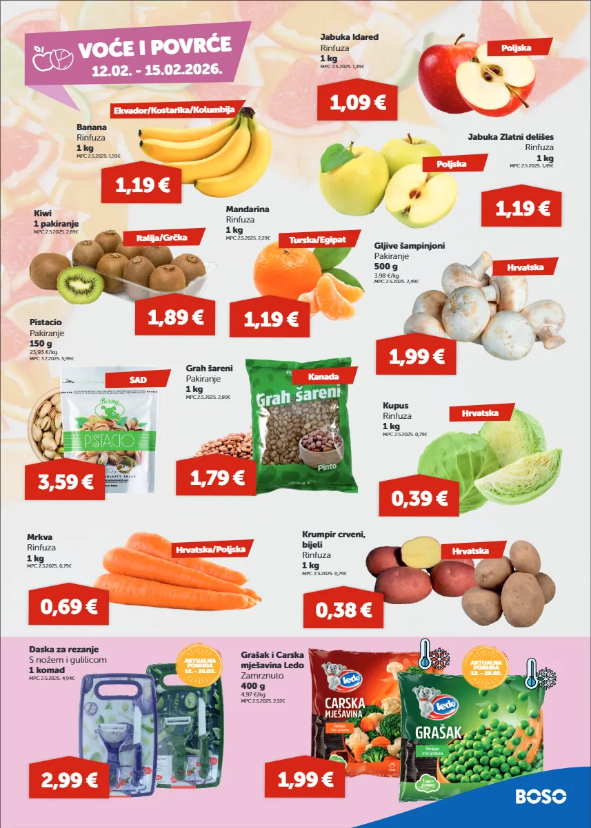 grašak i carska mješavina ledo zamrznuto 400 g 4,97 €/kg mpc 2.5.2025. 2,52€ 1,99 € daska za rezanje s nožem i gulilicom 1 komad mpc 2.5.2025. 4,94€ 2,99 € aktualna ponuda 12. - 25.02. aktualna ponuda 12. - 25.02. mandarina rinfuza 1 kg mpc 2.5.2025. 2,29€ 1,19 € banana rinfuza 1 kg mpc 2.5.2025. 1,59€ 1,19 € kiwi 1 pakiranje mpc 2.5.2025. 2,89€ 1,89 € jabuka idared rinfuza 1 kg mpc 2.5.2025. 1,49€ mrkva rinfuza 1 kg mpc 2.5.2025. 0,79€ 0,69 € kupus rinfuza 1 kg mpc 2.5.2025. 0,79€ 0,39 € grah šareni pakiranje 1 kg mpc 2.5.2025. 2,89€ 1,79 € gljive šampinjoni pakiranje 500 g 3,98 €/kg mpc 2.5.2025. 2,49€ 0,38 € pistacio pakiranje 150 g 23,93 €/kg mpc 3.7.2025. 5,99€ voće i povrće 3,59 € 1,99 € krumpir crveni, bijeli rinfuza 1 kg mpc 2.5.2025. 0,79€ jabuka zlatni delišes rinfuza 1 kg mpc 2.5.2025. 1,49€ 1,19 € 1,09 € hrvatska hrvatska hrvatska sad turska/egipat ekvador/kostarika/kolumbija italija/grčka hrvatska/poljska kanada poljska poljska 12.02. - 15.02.2026.