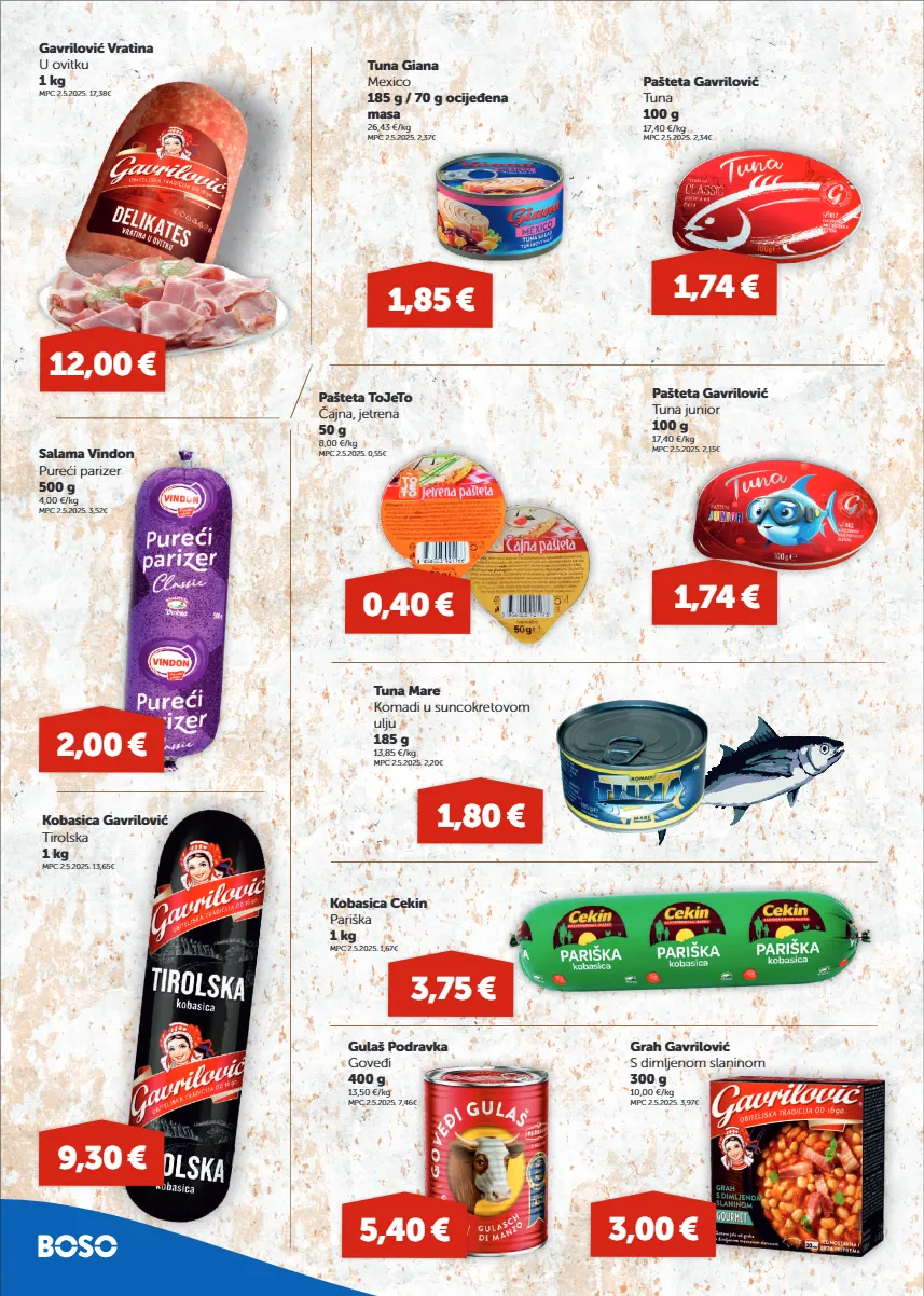 pašteta tojeto čajna, jetrena 50 g 8,00 €/kg mpc 2.5.2025. 0,55€ kobasica gavrilović tirolska 1 kg mpc 2.5.2025. 13,65€ 9,30 € pašteta gavrilović tuna 100 g 17,40 €/kg mpc 2.5.2025. 2,34€ 1,74 € 1,74 € pašteta gavrilović tuna junior 100 g 17,40 €/kg mpc 2.5.2025. 2,15€ grah gavrilović s dimljenom slaninom 300 g 10,00 €/kg mpc 2.5.2025. 3,97€ gavrilović vratina u ovitku 1 kg mpc 2.5.2025. 17,38€ 12,00 € gulaš podravka goveđi 400 g 13,50 €/kg mpc 2.5.2025. 7,46€ 5,40 € kobasica cekin pariška 1 kg mpc 2.5.2025. 1,67€ 3,75 € salama vindon pureći parizer 500 g 4,00 €/kg mpc 2.5.2025. 3,52€ 2,00 € tuna mare komadi u suncokretovom ulju 185 g 13,85 €/kg mpc 2.5.2025. 2,20€ 1,80 € tuna giana mexico 185 g / 70 g ocijeđena masa 26,43 €/kg mpc 2.5.2025. 2,37€ 1,85 € 3,00 € 0,40 €