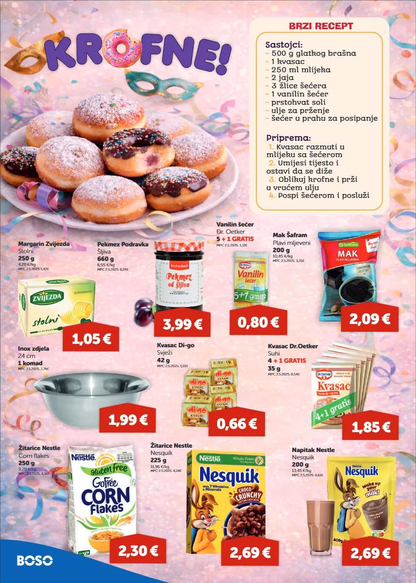 kvasac dr.oetker suhi 4 + 1 gratis 35 g mpc 2.5.2025. 0,54€ 0,80 € vanilin šećer dr. oetker 5 + 1 gratis mpc 2.5.2025. 1,31€ pekmez podravka šljiva 660 g 6,05 €/kg mpc 2.5.2025. 6,59€ mak šafram plavi mljeveni 200 g 10,45 €/kg mpc 2.5.2025. 3,25€ 2,09 € kvasac di-go svježi 42 g mpc 2.5.2025. 1,01€ 0,66 € margarin zvijezda stolni 250 g 4,20 €/kg mpc 2.5.2025. 1,42€ inox zdjela 24 cm 1 komad mpc 2.5.2025. 2,74€ 1,99 € žitarice nestle nesquik 225 g 11,96 €/kg mpc 2.5.2025. 4,28€ žitarice nestle corn flakes 250 g 9,20 €/kg mpc 2.5.2025. 3,36€ 2,30 € brzi recept sastojci: 500 g glatkog brašna - 1 kvasac - 250 ml mlijeka - 2 jaja - 3 žlice šećera - 1 vanilin šećer - prstohvat soli - ulje za prženje - šećer u prahu za posipanje - priprema: kvasac razmuti u 1. mlijeku sa šećerom umijesi tijesto i 2. ostavi da se diže oblikuj krofne i prži 3. u vrućem ulju pospi šećerom i posluži 4. napitak nestle nesquik 200 g 13,45 €/kg mpc 2.5.2025. 4,61€ 2,69 € 1,85 € 2,69 € 1,05 € 3,99 €