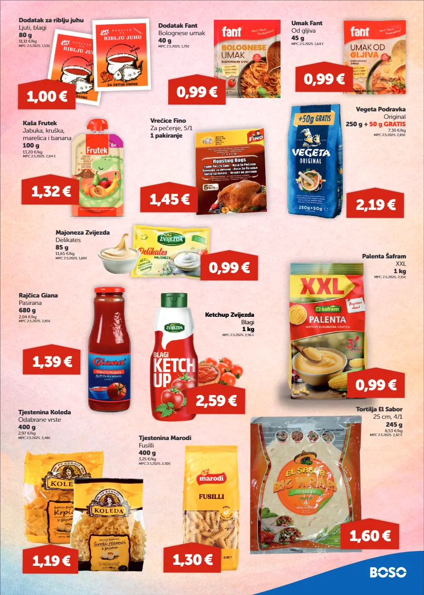 dodatak za riblju juhu ljuti, blagi 80 g 11,11 €/kg mpc 2.5.2025. 1,53€ vegeta podravka original 250 g + 50 g gratis 7,30 €/kg mpc 2.5.2025. 2,85€ 2,19 € umak fant od gljiva 45 g mpc 2.5.2025. 1,64 € 0,99 € dodatak fant bolognese umak 40 g mpc 2.5.2025. 1,75€ palenta šafram xxl 1 kg mpc 2.5.2025. 2,15€ 0,99 € majoneza zvijezda delikates 85 g 11,65 €/kg mpc 2.5.2025. 1,60€ 0,99 € rajčica giana pasirana 680 g 2,04 €/kg mpc 2.5.2025. 2,85€ tjestenina marodi fusilli 400 g 3,25 €/kg mpc 2.5.2025. 2,30€ vrećice fino za pečenje, 5/1 1 pakiranje kaša frutek jabuka, kruška, marelica i banana 100 g 13,20 €/kg mpc 2.5.2025. 2,04 € 1,32 € 1,39 € 1,00 € ketchup zvijezda blagi 1 kg mpc 2.5.2025. 3,96 € 2,59 € tortilja el sabor 25 cm, 4/1 245 g 6,53 €/kg mpc 2.5.2025. 2,42 € tjestenina koleda odabrane vrste 400 g 2,97 €/kg mpc 2.5.2025. 2,48€ 1,60 € 1,45 € 1,30 € 1,19 € 0,99 €