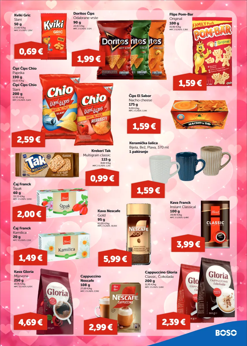 kava nescafe gold 95 g 63,05 €/kg mpc 2.5.2025. 10,55€ 5,99 € krekeri tak multigrain classic 115 g 8,61 €/kg mpc 2.5.2025. 1,31€ 2,99 € doritos čips odabrane vrste 90 g 22,11 €/kg mpc 2.5.2025. 2,52€ 1,99 € kava gloria mljevena 250 g 18,76 €/kg mpc 2.5.2025. 6,92€ 4,69 € cappuccino gloria classic, čokolada 200 g 11,95 €/kg mpc 2.5.2025. 3,40€ 2,39 € kava franck instant classical 100 g 39,90 €/kg mpc 2.5.2025. 6,48€ 3,99 € kviki gric slani 50 g 13,80 €/kg mpc 2.5.2025. 1,05€ 0,69 € flips pom-bar original 100 g 15,90 €/kg mpc 2.5.2025. 2,30€ 1,59 € čips el sabor nacho cheese 175 g 9,09 €/kg mpc 2.5.2025. 2,19€ cappuccino nescafe 108 g 27,69 €/kg mpc 2.5.2025. 2,99€ 0,99 € 2,00 € čaj franck šipak 60 g 33,33 €/kg mpc 2.5.2025. 3,03€ čaj franck kamilica 20 g mpc 2.5.2025. 2,31€ 1,49 € 2,59 € keramička šalica bijela, bež, plava, 370 ml 1 pakiranje 1,59 € čipi čips chio paprika 190 g 13,63 €/kg čipi čips chio slani 200 g 12,95 €/kg mpc 2.5.2025. 3,62€ 1,59 €