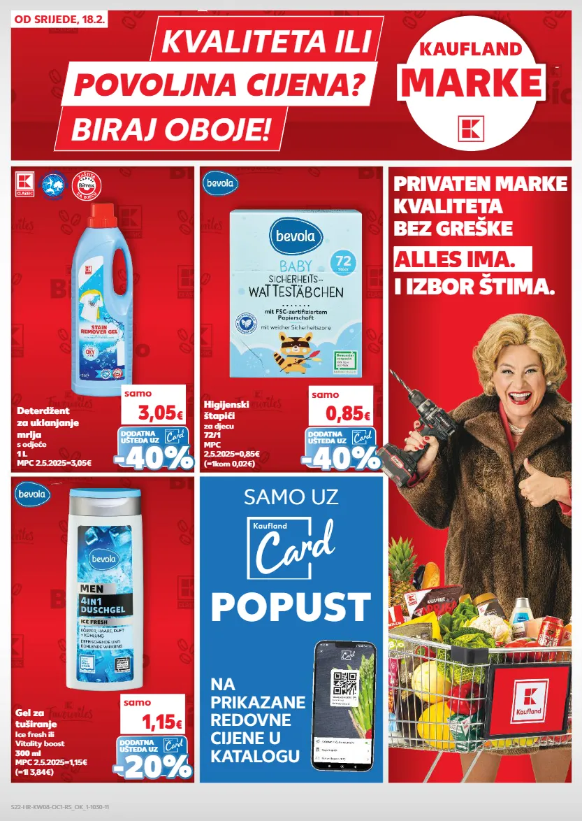 iste cijene na kopnu i na moru! kratkotrajna ponuda kratkotrajna ponuda samo kratkotrajna ponuda samo zatvoreni smo u nedjelju, 22.2.2026. od srijede, 18.2. do utorka, 24.2.2026. želiš još bogatiju ponudu? dobiješ je u online katalogu! goodara pivo craft razne vrste 4,3-4,7% alkohola 0,5 l mpc 2.5.2025=2,02€ (=1 l 3,18€) trajno mlijeko 3,5%m.m. bez laktoze 1 l mpc 2.5.2025=1,75€ pšenična peciva predpečena 6 x 50 g mpc 2.5.2025=0,99€ (=1 kg 1,97€) bez laktoze super cijena samo 1,59 € -37% 0,99 € 1,59 € -36% 0,59 € 0,93 € (=1 kg 4,33€) lisnato tijesto 275 g mpc 2.5.2025=1,19€ samo 1,19 € - - 35 % 35 % dodatna ušteda uz pšenična peciva pivo i vino više na str. 8-13 više na str. 2-7 više na str. 2-7 brunch kaufland marke više na str. 14-15 više na str. 14-15 bez laktoze i glutena više na str. 18-20 s1-hr-kw08-oc1-ts_ok_1-1030-11