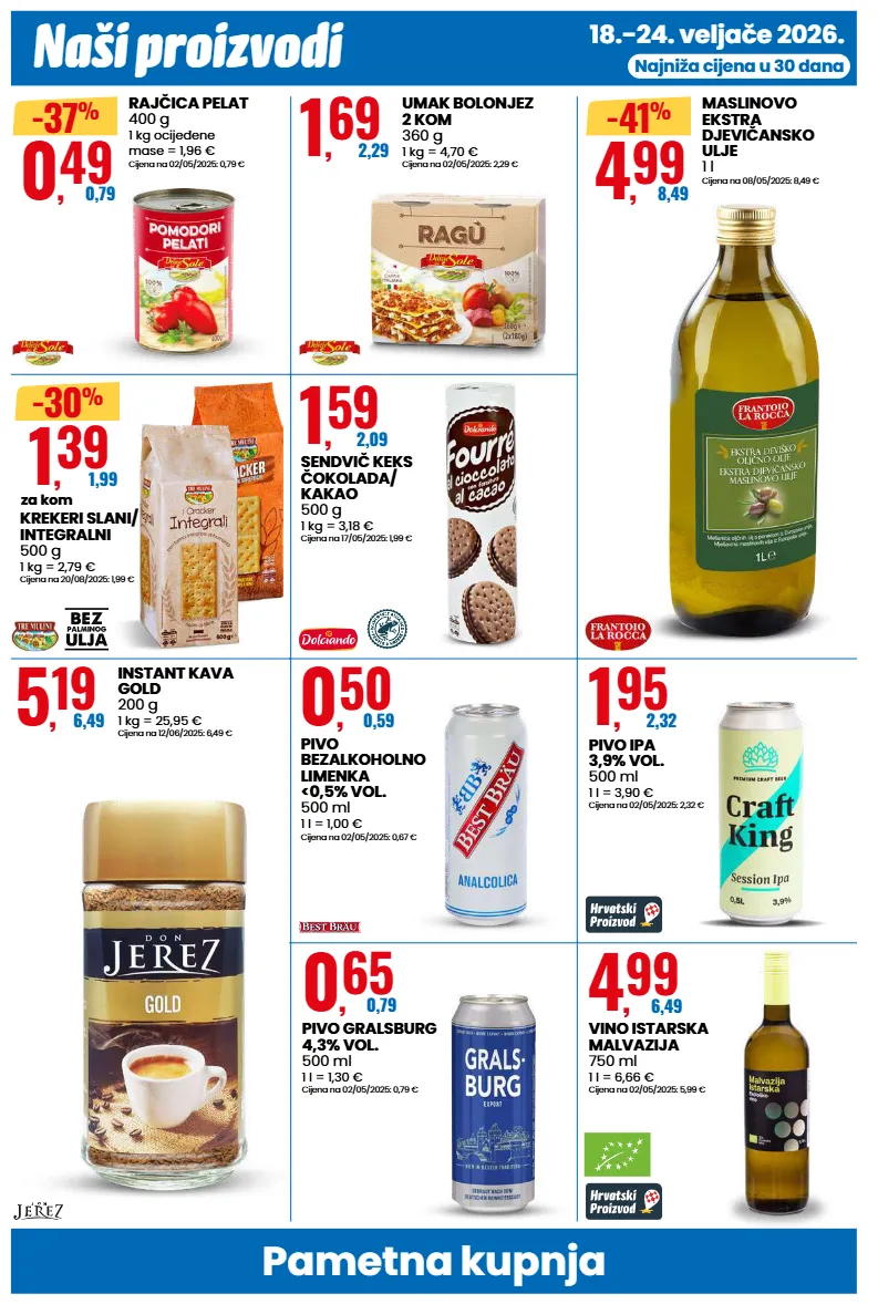 naši proizvodi pametna kupnja 18.-24. veljače 2026. najniža cijena u 30 dana 0 , 49 0,79 -37 % rajčica pelat 400 g 1 kg ocijeđene mase = 1,96 € cijena na 02/05/2025: 0,79 € 1 , 69 2,29 umak bolonjez 2 kom 360 g 1 kg = 4,70 € cijena na 02/05/2025: 2,29 € 4 , 99 8,49 -41 % maslinovo ekstra djevičansko ulje 1 l cijena na 08/05/2025: 8,49 € 1 , 39 1,99 za kom -30 % krekeri slani/ integralni 500 g 1 kg = 2,79 € cijena na 20/08/2025: 1,99 € 1 , 59 2,09 sendvič keks čokolada/ kakao 500 g 1 kg = 3,18 € cijena na 17/05/2025: 1,99 € 5 , 19 6,49 instant kava gold 200 g 1 kg = 25,95 € cijena na 12/06/2025: 6,49 € 0 , 65 0,79 pivo gralsburg 4,3% vol. 500 ml 1 l = 1,30 € cijena na 02/05/2025: 0,79 € 0 , 50 0,59 pivo bezalkoholno limenka <0,5% vol. 500 ml 1 l = 1,00 € cijena na 02/05/2025: 0,67 € 4 , 99 6,49 vino istarska malvazija 750 ml 1 l = 6,66 € cijena na 02/05/2025: 5,99 € 1 , 95 2,32 pivo ipa 3,9% vol. 500 ml 1 l = 3,90 € cijena na 02/05/2025: 2,32 €