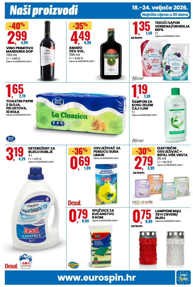 www.eurospin.hr naši proizvodi 18.-24. veljače 2026. najniža cijena u 30 dana 2 , 99 4,99 -40 % vino primitivo manduria dop 750 ml 1 l = 3,99 € cijena na 02/05/2025: 5,02 € 4 , 49 6,99 -35 % amaro 35% vol. 700 ml 1 l = 6,42 € cijena na 02/05/2025: 6,49 € 1 , 65 2,19 toaletni papir 3 sloja, 118 listova, 10 rola cijena na 02/05/2025: 2,19 € 1 , 35 1,59 za kom tekući sapun verbena/orhideja refil 1 l cijena na 02/05/2025: 1,59 € 1 , 19 1,59 šampon za kosu zeleni čaj i lan 1 l cijena na 02/05/2025: 1,59 € 0 , 69 1,09 -36 % osvježivač za perilicu suða limun cijena na 02/05/2025: 1,09 € 2 , 79 3,99 za kom -30 % električni osvježivač + refill više vrsta 25 ml 1 l = 111,72 € cijena na 02/05/2025: 3,99 € 0 , 79 0,99 spužvice za kućanstvo 8 kom cijena na 02/05/2025: 0,99 € 0 , 75 0,99 za kom lampioni mali 38 h crveni/ bijeli cijena na 02/05/2025: 0,99 € 3 , 19 4,29 deterdžent za bijelo rublje 3 l 1 l = 1,07 € cijena na 02/05/2025: 4,29 € po pranju 0,08 €