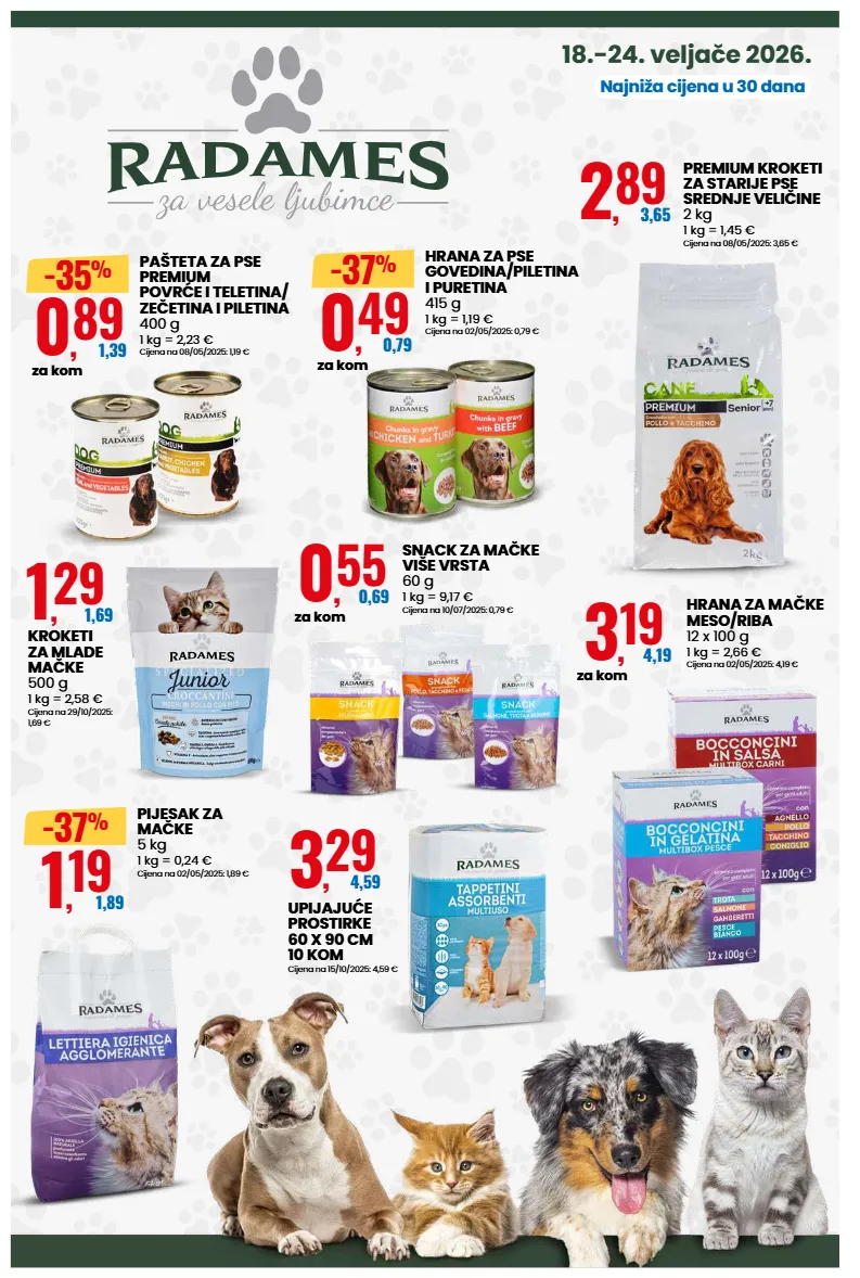 18.-24. veljače 2026. najniža cijena u 30 dana 2 , 89 3,65 premium kroketi za starije pse srednje veličine 2 kg 1 kg = 1,45 € cijena na 08/05/2025: 3,65 € 0 , 89 1,39 za kom -35 % pašteta za pse premium povrće i teletina/ zečetina i piletina 400 g 1 kg = 2,23 € cijena na 08/05/2025: 1,19 € 0 , 55 0,69 za kom snack za mačke više vrsta 60 g 1 kg = 9,17 € cijena na 10/07/2025: 0,79 € 3 , 29 4,59 upijajuće prostirke 60 x 90 cm 10 kom cijena na 15/10/2025: 4,59 € 3 , 19 4,19 za kom hrana za mačke meso/riba 12 x 100 g 1 kg = 2,66 € cijena na 02/05/2025: 4,19 € 0 , 49 0,79 za kom -37 % hrana za pse govedina/piletina i puretina 415 g 1 kg = 1,19 € cijena na 02/05/2025: 0,79 € 1 , 29 1,69 kroketi za mlade mačke 500 g 1 kg = 2,58 € cijena na 29/10/2025: 1,69 € 1 , 19 1,89 -37 % pijesak za mačke 5 kg 1 kg = 0,24 € cijena na 02/05/2025: 1,89 €
