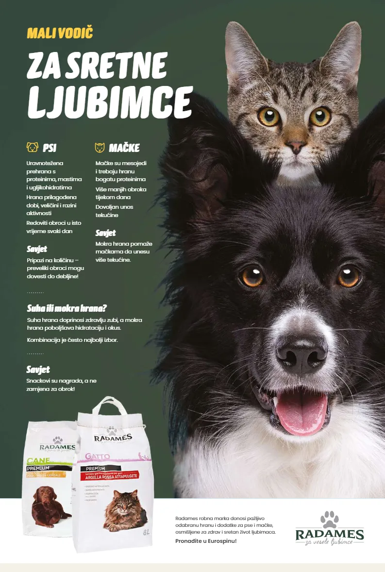 MALI VODIČ ZA SRETNE LJUBIMCE Uravnotežena prehrana s proteinima, mastima i ugljikohidratima Hrana prilagođena dobi, veličini i razini aktivnosti Redoviti obroci u isto vrijeme svaki dan Mačke su mesojedi i trebaju hranu bogatu proteinima Više manjih obroka tijekom dana Dovoljan unos tekućine Suha ili mokra hrana? Suha hrana doprinosi zdravlju zubi, a mokra hrana poboljšava hidrataciju i okus. Kombinacija je često najbolji izbor. Radames robna marka donosi pažljivo odabranu hranu i dodatke za pse i mačke, osmišljene za zdrav i sretan život ljubimaca. Pronađite u Eurospinu! Savjet Snackovi su nagrada, a ne zamjena za obrok! Savjet Pripazi na količinu – preveliki obroci mogu dovesti do debljine! Savjet Mokra hrana pomaže mačkama da unesu više tekućine. PSI MAČKE