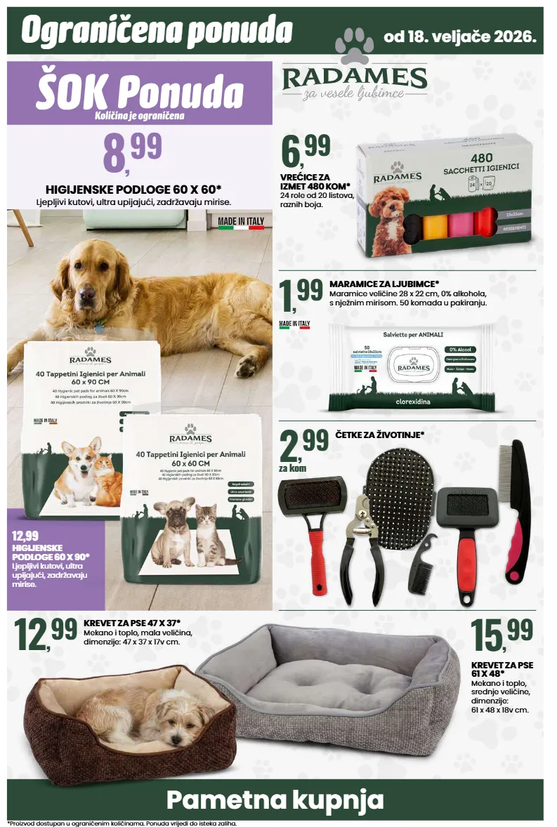 pametna kupnja ograničena ponuda *proizvod dostupan u ograničenim količinama. ponuda vrijedi do isteka zaliha. od 18. veljače 2026. higijenske podloge 60 x 60* ljepljivi kutovi, ultra upijajući, zadržavaju mirise. 8 , 99 maramice za ljubimce* maramice veličine 28 x 22 cm, 0% alkohola, s nježnim mirisom. 50 komada u pakiranju. 1 , 99 vrećice za izmet 480 kom* 24 role od 20 listova, raznih boja. 6 , 99 krevet za pse 47 x 37* mekano i toplo, mala veličina, dimenzije: 47 x 37 x 17v cm. 12 , 99 krevet za pse 61 x 48* mekano i toplo, srednje veličine, dimenzije: 61 x 48 x 18v cm. 15 , 99 12,99 higijenske podloge 60 x 90* ljepljivi kutovi, ultra upijajući, zadržavaju mirise. četke za životinje* 2 , 99 za kom