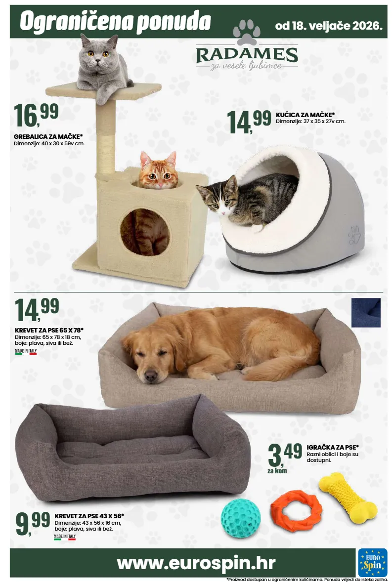 *proizvod dostupan u ograničenim količinama. ponuda vrijedi do isteka zaliha. ograničena ponuda od 18. veljače 2026. www.eurospin.hr grebalica za mačke* dimenzije: 40 x 30 x 59v cm. 16 , 99 krevet za pse 43 x 56* dimenzije: 43 x 56 x 16 cm, boje: plava, siva ili bež. 9 , 99 krevet za pse 65 x 78* dimenzije: 65 x 78 x 18 cm, boje: plava, siva ili bež. 14 , 99 kućica za mačke* dimenzije: 37 x 35 x 27v cm. 14 , 99 igračka za pse* razni oblici i boje su dostupni. 3 , 49 za kom