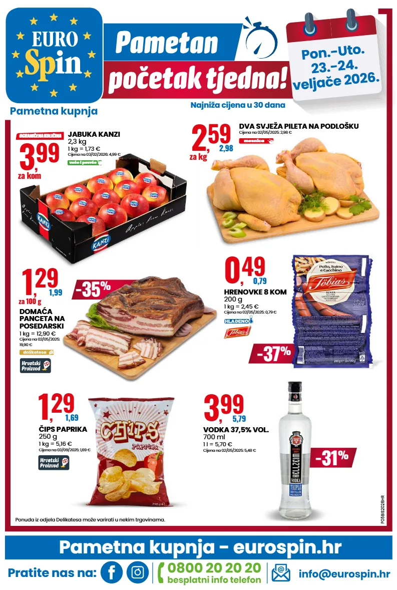 pametna kupnja - eurospin.hr pratite nas na: pon.-uto. 23.-24. veljače 2026. najniža cijena u 30 dana p05bis2026hr ponuda iz odjela delikatesa može varirati u nekim trgovinama. dva svježa pileta na podlošku cijena na 02/05/2025: 2,98 € 2 , 59 2,98 za kg mesnica -35 % domaća panceta na posedarski 1 kg = 12,90 € cijena na 02/05/2025: 19,90 € 1 , 29 1,99 za 100 g 1 , 29 1,69 čips paprika 250 g 1 kg = 5,16 € cijena na 03/09/2025: 1,69 € -31 % 3 , 99 5,79 vodka 37,5% vol. 700 ml 1 l = 5,70 € cijena na 02/05/2025: 5,48 € -37 % 0 , 49 0,79 hrenovke 8 kom 200 g 1 kg = 2,45 € cijena na 02/05/2025: 0,79 € jabuka kanzi 2,3 kg 1 kg = 1,73 € cijena na 03/02/2026: 4,99 € 3 , 99 za kom voće i povrće ograničena količina
