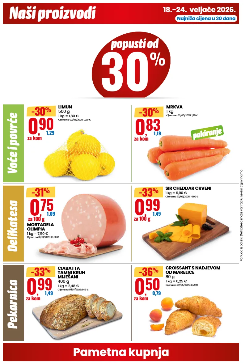 18.-24. veljače 2026. naši proizvodi pametna kupnja najniža cijena u 30 dana voće i povrće delikatesa pekarnica ponuda iz odjela delikatesa može varirati u nekim trgovinama. sir cheddar crveni 1 kg = 9,90 € cijena na 27/09/2025: 14,90 € 0 , 99 1,49 za 100 g -33 % mortadela olimpia 1 kg = 7,50 € cijena na 01/01/2026: 10,90 € 0 , 75 1,09 za 100 g -31 % ciabatta tamni kruh miješani 400 g 1 kg = 2,48 € cijena na 17/07/2025: 1,49 € 0 , 99 1,49 za kom -33 % croissant s nadjevom od marelice 80 g 1 kg = 6,25 € cijena na 02/05/2025: 0,79 € 0 , 50 0,79 za kom -36 % mrkva 1 kg cijena na 02/05/2025: 1,25 € pakiranje 0 , 83 1,19 za kom limun 500 g 1 kg = 1,80 € cijena na 02/05/2025: 0,99 € 0 , 90 1,29 za kom -30 % -30 %