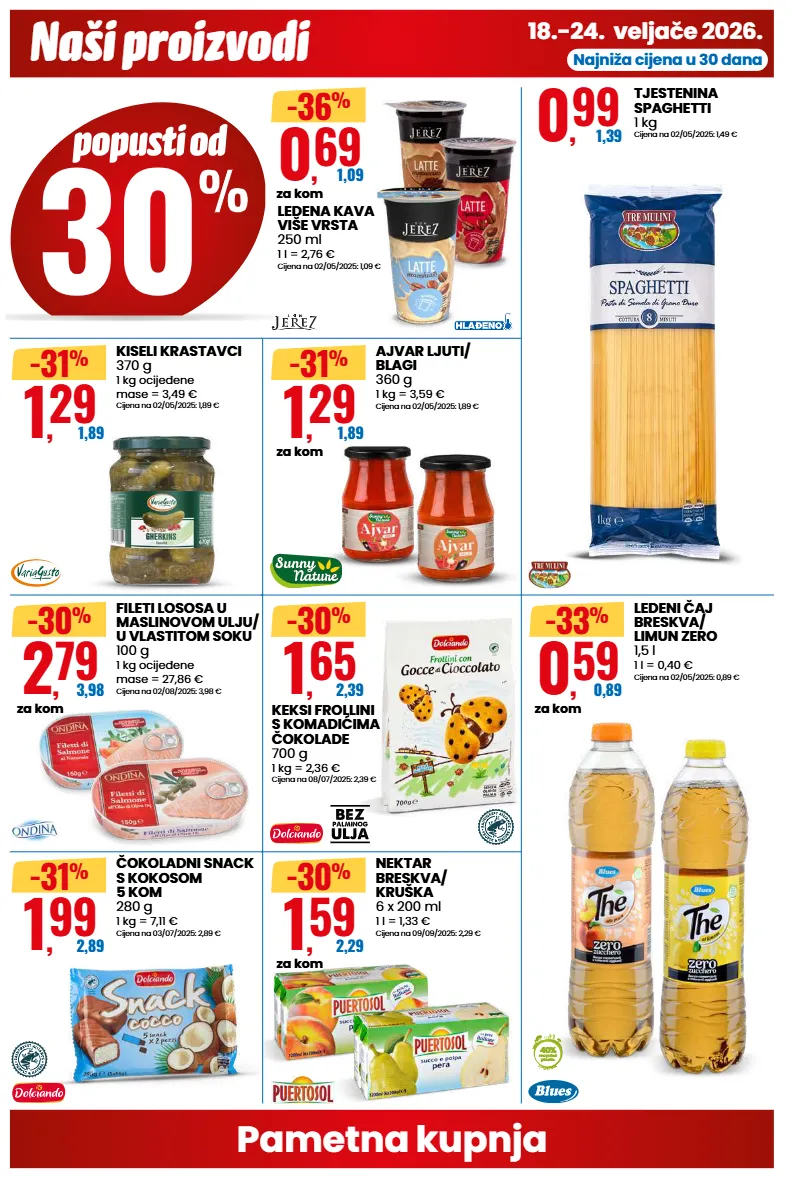 pametna kupnja naši proizvodi 18.-24. veljače 2026. najniža cijena u 30 dana 0 , 69 1,09 za kom -36 % ledena kava više vrsta 250 ml 1 l = 2,76 € cijena na 02/05/2025: 1,09 € 0 , 99 1,39 tjestenina spaghetti 1 kg cijena na 02/05/2025: 1,49 € 1 , 29 1,89 za kom -31 % ajvar ljuti/ blagi 360 g 1 kg = 3,59 € cijena na 02/05/2025: 1,89 € 1 , 29 1,89 -31 % kiseli krastavci 370 g 1 kg ocijeđene mase = 3,49 € cijena na 02/05/2025: 1,89 € 2 , 79 3,98 za kom -30 % fileti lososa u maslinovom ulju/ u vlastitom soku 100 g 1 kg ocijeđene mase = 27,86 € cijena na 02/08/2025: 3,98 € 1 , 65 2,39 -30 % keksi frollini s komadićima čokolade 700 g 1 kg = 2,36 € cijena na 08/07/2025: 2,39 € 1 , 99 2,89 -31 % čokoladni snack s kokosom 5 kom 280 g 1 kg = 7,11 € cijena na 03/07/2025: 2,89 € 1 , 59 2,29 za kom -30 % nektar breskva/ kruška 6 x 200 ml 1 l = 1,33 € cijena na 09/09/2025: 2,29 € 0 , 59 0,89 za kom 40% recycled plastic -33 % ledeni čaj breskva/ limun zero 1,5 l 1 l = 0,40 € cijena na 02/05/2025: 0,89 €