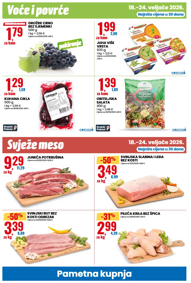 svježe meso voće i povrće 18.-24. veljače 2026. 18.-24. veljače 2026. pametna kupnja najniža cijena u 30 dana najniža cijena u 30 dana juneća potrbušina cijena na 02/05/2025: 10,39 € 9 , 29 11,29 za kg svinjska slabina i leđa bez kosti cijena na 12/12/2025: 6,99 € 3 , 49 6,99 za kg -50 % svinjski but bez kosti odrezak cijena na 02/05/2025: 6,99 € 3 , 39 6,89 za kg -50 % pileća krila bez špica cijena na 29/05/2025: 4,19 € 2 , 99 4,39 za kg -31 % grožđe crno bez sjemenki 500 g 1 kg = 3,58 € cijena na 02/05/2025: 1,99 € 1 , 79 za kom ograničena količina juha više vrsta 620 g 1 kg = 3,21 € cijena na 02/05/2025: 2,69 € 1 , 99 2,69 za kom kuhana cikla 500 g 1 kg = 2,58 € cijena na 01/08/2025: 1,69 € 1 , 29 1,59 za kom obiteljska salata 400 g 1 kg = 3,48 € cijena na 02/05/2025: 1,89 € 1 , 39 1,89 za kom pakiranje