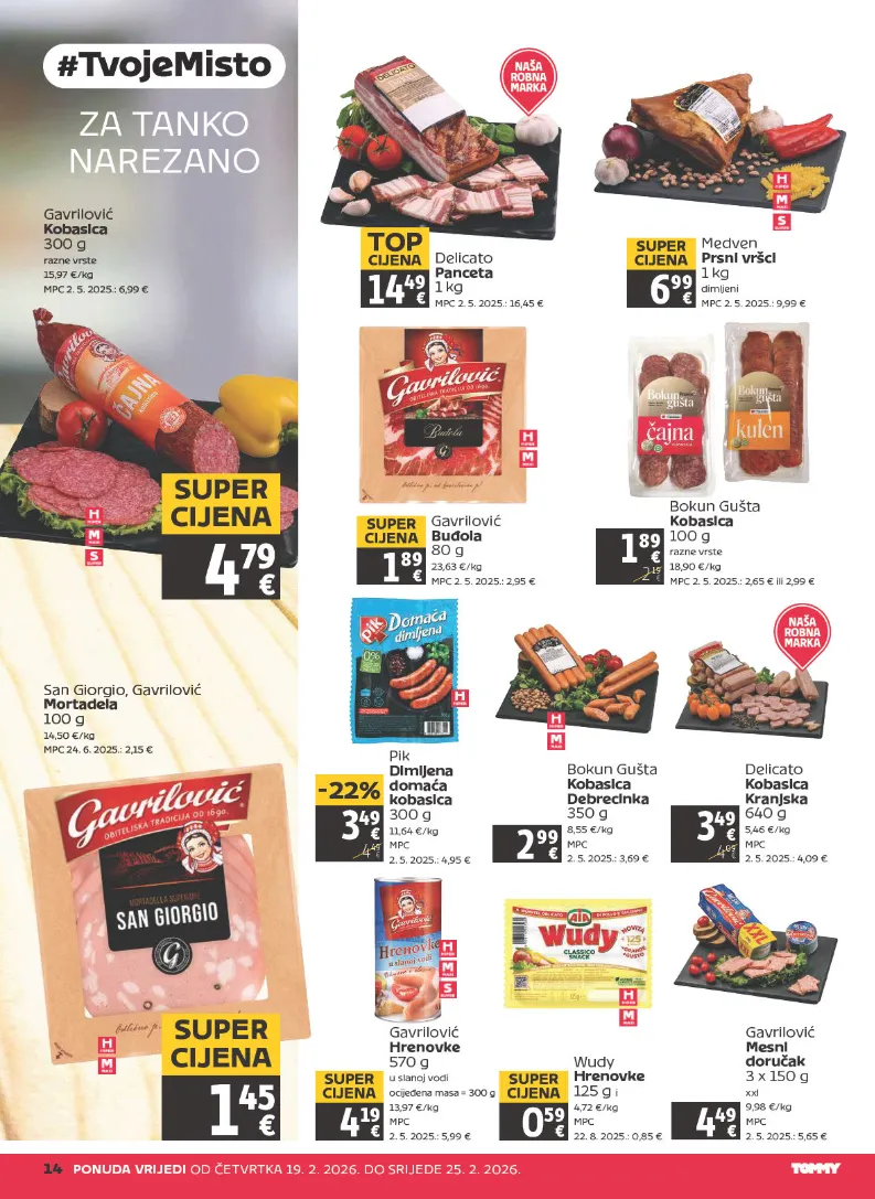 1 4 P O N U D A V RI J E DI O D Č E T V R T K A 1 9. 2. 2 0 2 6. D O S RI J E D E 2 5. 2. 2 0 2 6. 3 4 9 4 4 9 - 2 2 % Pi k Di mlj e n a d o m a ć a k o b a si c a 3 0 0 g 1 1, 6 4 € / k g M P C 2. 5. 2 0 2 5.: 4, 9 5 € Z A T A N K O N A R E Z A N O G a vril o vi ć K o b a si c a 3 0 0 g r a z n e vr st e 1 5, 9 7 € / k g M P C 2. 5. 2 0 2 5.: 6, 9 9 € S a n Gi or gi o, G a vril o vi ć M o r t a d el a 1 0 0 g 1 4, 5 0 € / k g M P C 2 4. 6. 2 0 2 5.: 2, 1 5 € 4 7 9 S U P E R CI J E N A 1 45 S U P E R CI J E N A D eli c at o P a n c e t a 1 k g M P C 2. 5. 2 0 2 5.: 1 6, 4 5 € 1 4 4 9 T O P CI J E N A M e d v e n P r s ni v r š ci 1 k g di mlj e ni M P C 2. 5. 2 0 2 5.: 9, 9 9 € 6 9 9 S U P E R CI J E N A 1 8 9 2 1 9 B o k u n G u št a K o b a si c a 1 0 0 g r a z n e vr st e 1 8, 9 0 € / k g M P C 2. 5. 2 0 2 5.: 2, 6 5 € ili 2, 9 9 € B o k u n G u št a K o b a si c a D e b r e ci n k a 3 5 0 g 8, 5 5 € / k g M P C 2. 5. 2 0 2 5.: 3, 6 9 € 2 9 9 3 4 9 4 0 9 D eli c at o K o b a si c a K r a nj s k a 6 4 0 g 5, 4 6 € / k g M P C 2. 5. 2 0 2 5.: 4, 0 9 € G a vril o vi ć H r e n o v k e 5 7 0 g u sl a n oj v o di o cij e đ e n a m a s a = 3 0 0 g 1 3, 9 7 € / k g M P C 2. 5. 2 0 2 5.: 5, 9 9 € 4 1 9 S U P E R CI J E N A W u d y H r e n o v k e 1 2 5 g i 4, 7 2 € / k g M P C 2 2. 8. 2 0 2 5.: 0, 8 5 € 0 5 9 S U P E R CI J E N A G a vril o vi ć M e s ni d o r u č a k 3 x 1 5 0 g x xl 9, 9 8 € / k g M P C 2. 5. 2 0 2 5.: 5, 6 5 € 4 4 9 G a vril o vi ć B u đ ol a 8 0 g 2 3, 6 3 € / k g M P C 2. 5. 2 0 2 5.: 2, 9 5 € 1 8 9 S U P E R CI J E N A