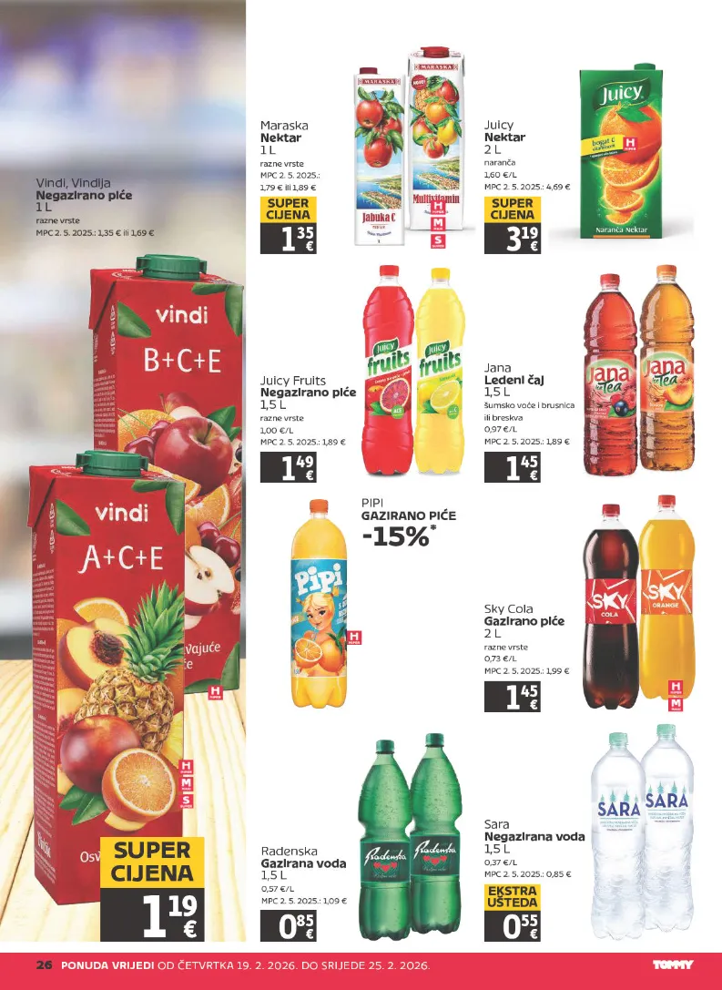 2 6 P O N U D A V RI J E DI O D Č E T V R T K A 1 9. 2. 2 0 2 6. D O S RI J E D E 2 5. 2. 2 0 2 6. Vi n di, Vi n dij a N e g a zi r a n o pi ć e 1 L r a z n e vr st e M P C 2. 5. 2 0 2 5.: 1, 3 5 € ili 1, 6 9 € 1 1 9 S U P E R CI J E N A J ui c y N e k t a r 2 L n ar a n č a 1, 6 0 € / L M P C 2. 5. 2 0 2 5.: 4, 6 9 € 3 1 9 S U P E R CI J E N A J ui c y Fr uit s N e g a zi r a n o pi ć e 1, 5 L r a z n e vr st e 1, 0 0 € / L M P C 2. 5. 2 0 2 5.: 1, 8 9 € 1 4 9 J a n a L e d e ni č aj 1, 5 L š u m s k o v o ć e i br u s ni c a ili br e s k v a 0, 9 7 € / L M P C 2. 5. 2 0 2 5.: 1, 8 9 € 1 45 PI PI G A ZI R A N O PI Ć E - 1 5 % * S k y C ol a G a zi r a n o pi ć e 2 L r a z n e vr st e 0, 7 3 € / L M P C 2. 5. 2 0 2 5.: 1, 9 9 € 1 45 M ar a s k a N e k t a r 1 L r a z n e vr st e M P C 2. 5. 2 0 2 5.: 1, 7 9 € ili 1, 8 9 € 1 35 S U P E R CI J E N A R a d e n s k a G a zi r a n a v o d a 1, 5 L 0, 5 7 € / L M P C 2. 5. 2 0 2 5.: 1, 0 9 € 0 85 S ar a N e g a zi r a n a v o d a 1, 5 L 0, 3 7 € / L M P C 2. 5. 2 0 2 5.: 0, 8 5 € 0 55 E K S T R A U Š T E D A